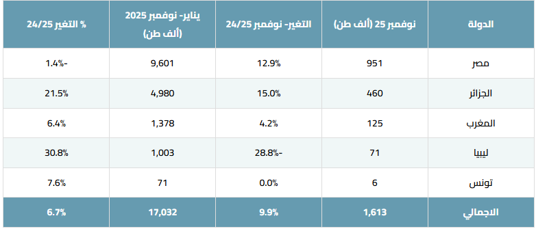 وقادت الجزائر نمو المنطقة بإنتاج تراكمي بلغ 4.98 مليون طن وبنسبة نمو قوية 21.5%، بينما حافظت مصر على أعلى مستوى إنتاج في المنطقة عند 9.6 مليون طن رغم تسجيل تراجع طفيف في الأداء السنوي (-1.4%)، كما سجلت ليبيا نموًا تراكميًا ملحوظًا بنسبة 30.8%، رغم الانخفاض الحاد في إنتاج شهر نوفمبر، في حين واصلت المغرب وتونس تحقيق نمو محدود ولكن مستقر.