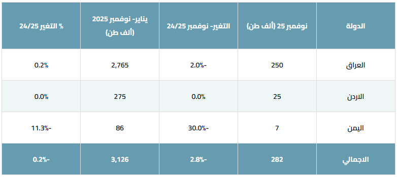 ويُعزى هذا الأداء إلى تباين أوضاع الدول المنتجة داخل المنطقة، إذ حافظ العراق والأردن على مستويات إنتاج شبه مستقرة، في حين واصلت اليمن تسجيل انخفاضات نتيجة التحديات التشغيلية والاقتصادية.