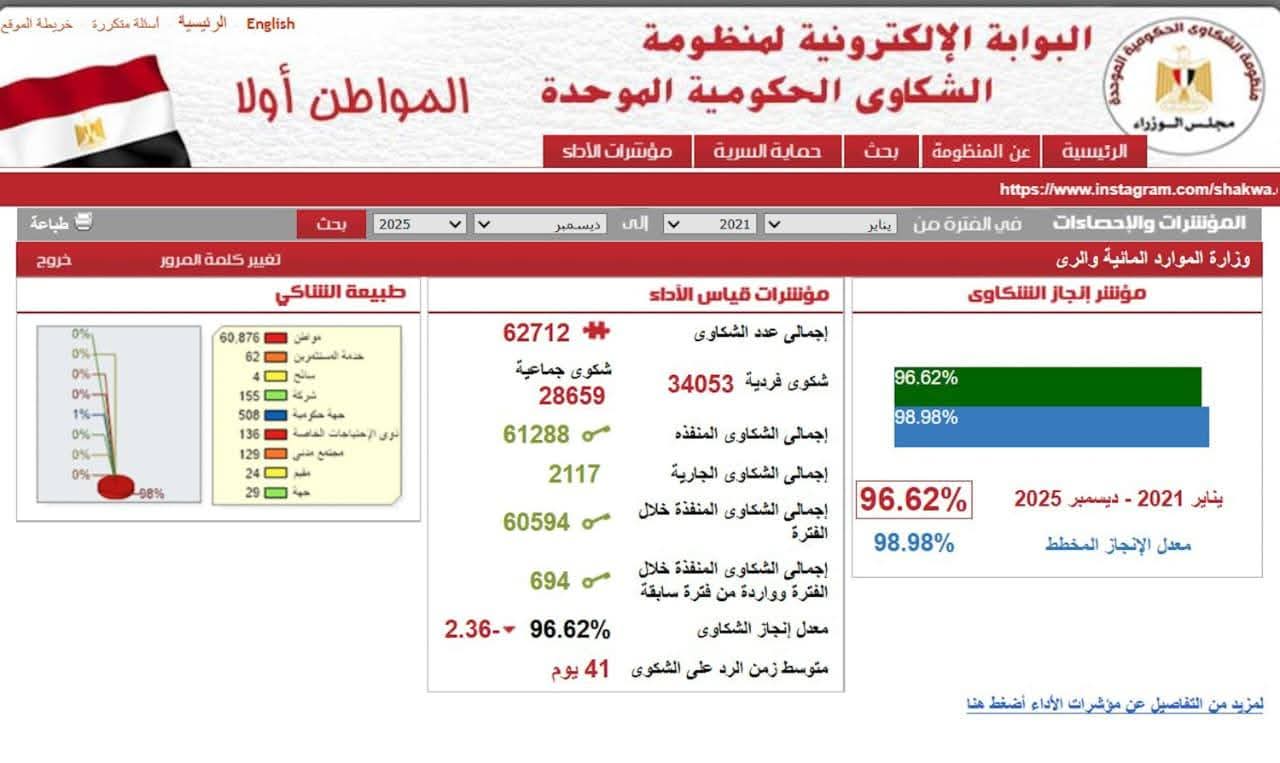 وأشار التقرير إلى أن وزارة الموارد المائية والري قامت بدراسة وبحث 1177 شكوى وطلبًا واستغاثة خلال شهر ديسمبر 2025 فقط، بينما بلغت نسبة حسم الشكاوى خلال الفترة من يناير 2021 وحتى نهاية ديسمبر 2025 نحو 96.62%، وفقًا لمؤشرات منظومة الشكاوى الحكومية الموحدة بمجلس الوزراء.