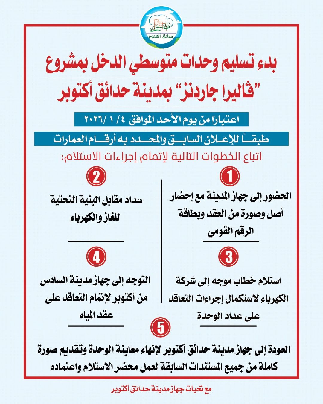 وتهيب إدارة الجهاز بالسادة المخصص لهم الوحدات، الالتزام بالخطوات التالية لإتمام إجراءات استلام الحضور إلى جهاز مدينة حدائق أكتوبر، مع إحضار أصل وصورة من العقد ، وبطاقة الرقم القومي، وسداد مقابل البنية التحتية للغاز والكهرباء، واستلام خطابٍ موجهٍ إلى شركة الكهرباء لاستكمال إجراءات التعاقد على عداد الوحدة.