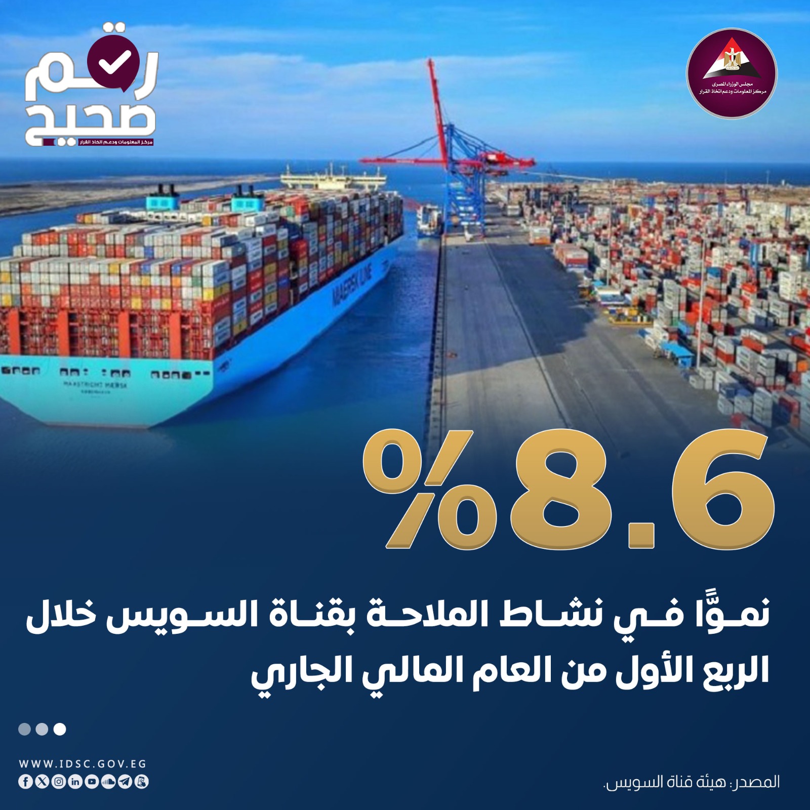 أكد مركز المعلومات ودعم اتخاذ القرار التابع لمجلس الوزراء أن نشاط الملاحة بقناة السويس شهد تعافيًا خلال العام المالي الجاري، مسجلاً نموًا إيجابيًا في الربع الأول من العام المالي الجاري بنسبة 8.6%، مع بدء العودة التدريجية للاستقرار بمنطقة البحر الأحمر، رغم التحديات التي تعرضت لها القناة منذ أكتوبر 2023 نتيجة التوترات الإقليمية، والتي أسهمت في انخفاض حركة الملاحة بشكل كبير.