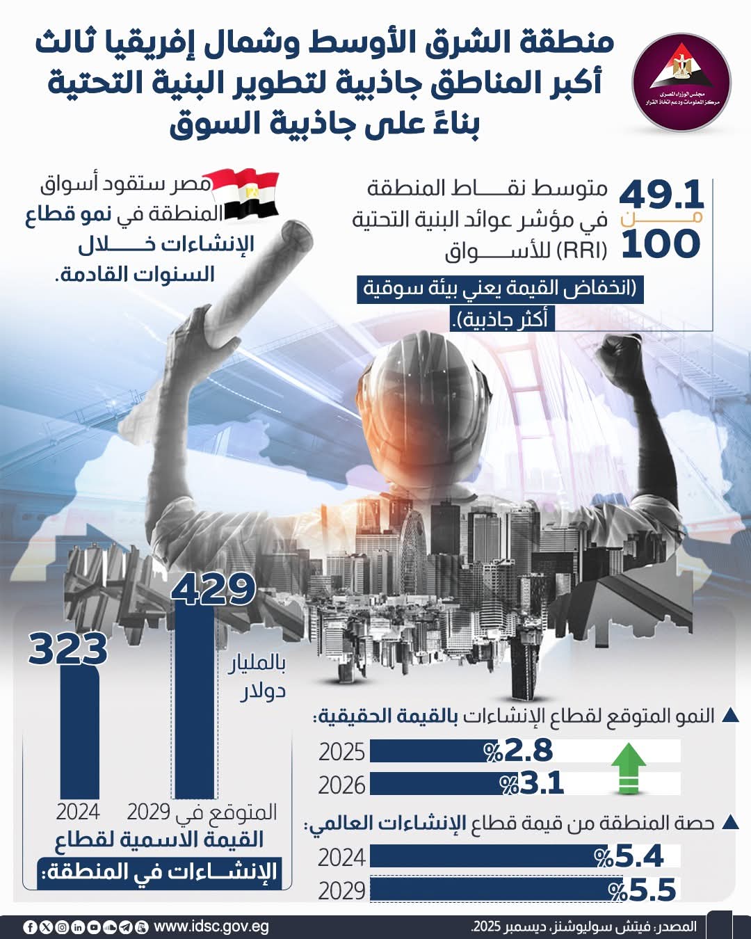 وتشير البيانات إلى أن مصر تقود أسواق المنطقة في نمو قطاع الإنشاءات خلال السنوات المقبلة، مدفوعة بحزم استثمارية ضخمة ومشروعات قومية كبرى في مجالات النقل، والطاقة، والعمران.