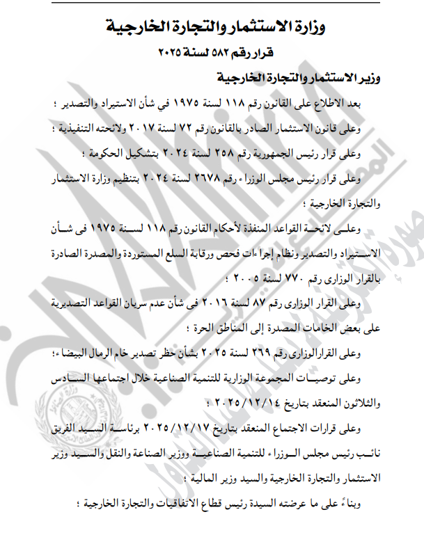 نشرت الجريدة الرسمية، اليوم الاثنين 5 يناير 2025، قرار المهندس حسن الخطيب، وزير الاستثمار والتجارة الخارجية، رقم 582 لسنة 2025، بشأن حظر تصدير خام الرمال البيضاء، مع استثناءات محددة للمشروعات الإنتاجية في المناطق الحرة داخل مصر.
