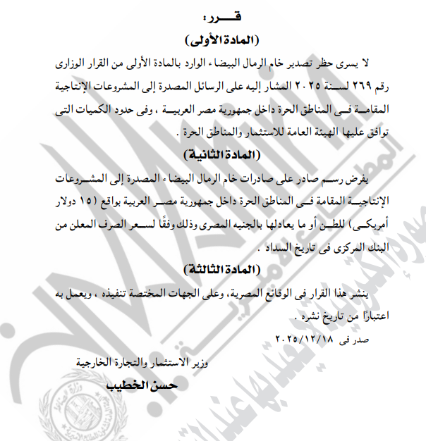 أما المادة الثانية فقد نصت على فرض رسم صادر على صادرات خام الرمال البيضاء المصدرة إلى تلك المشروعات في المناطق الحرة، بقيمة 15 دولارًا أمريكيًا للطن أو ما يعادلها بالجنيه المصري حسب سعر الصرف المعلن من البنك المركزي عند تاريخ السداد.