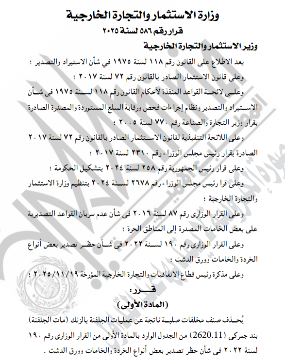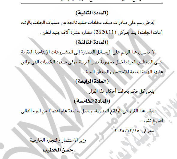 نشرت الجريدة الرسمية، في عددها رقم (4) الصادر اليوم 5 يناير 2026، قرار المهندس حسن الخطيب وزير الاستثمار والتجارة الخارجية رقم 586 لسنة 2025، بشأن تنظيم تصدير المخلفات الصلبة الناتجة عن عمليات الجلفنة بالزنك «مات الجلفنة».