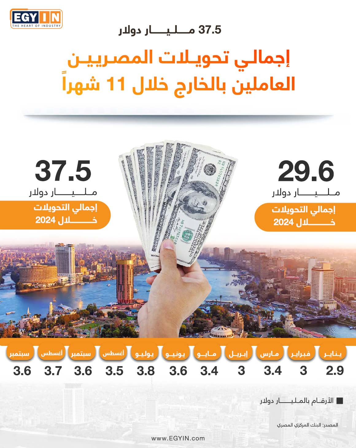 37.5 مليار دولار، رحلة تحويلات المصريين العاملين بالخارج خلال 11 شهرًا (إنفوجراف)