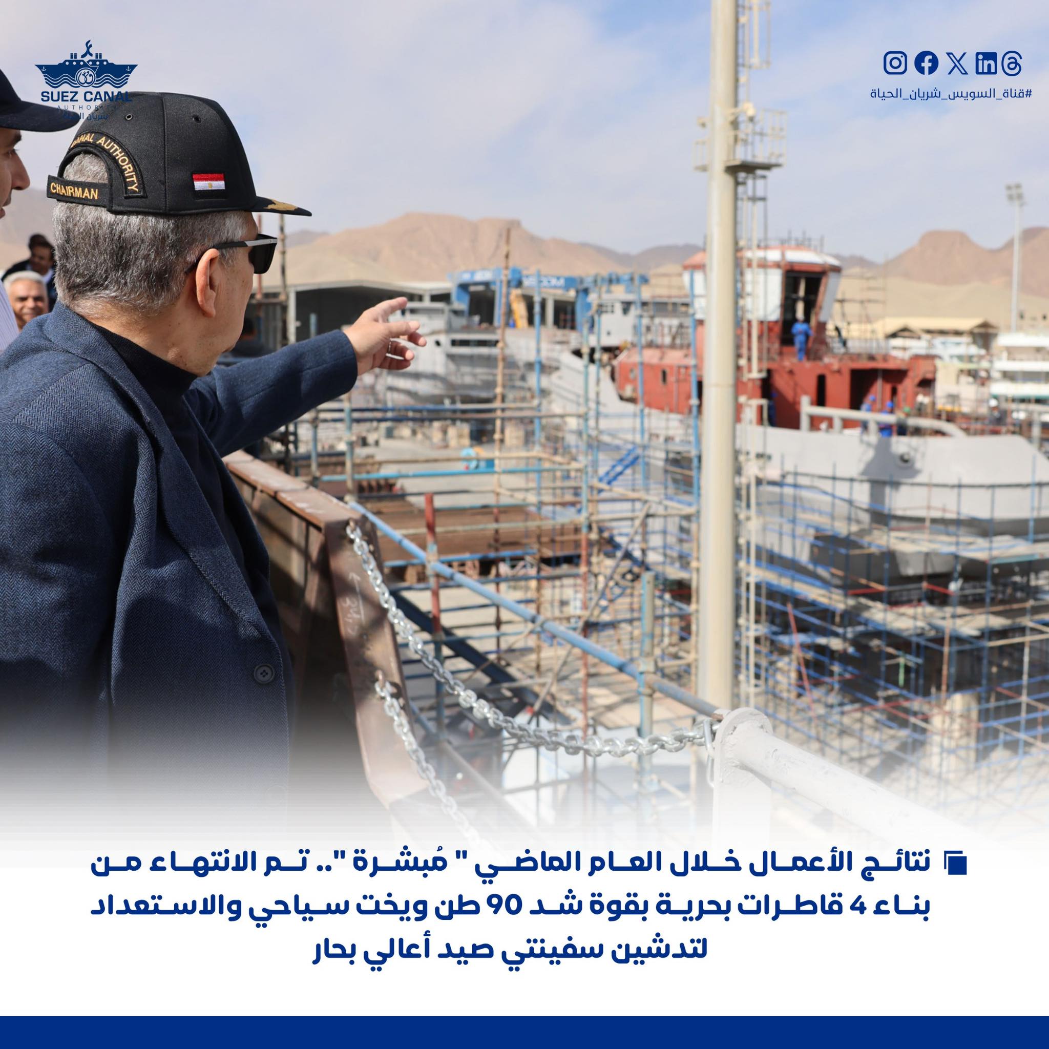 وأشار الفريق ربيع إلى أن نتائج الأعمال الخاصة بالشراكة بين هيئة قناة السويس وشركة ترسانة جنوب البحر الأحمر خلال العام الماضي جاءت مُبشرة حيث تم الانتهاء من بناء 4 قاطرات بحرية بقوة شد 90 طنًا، بالإضافة إلى بناء يخت سياحي وذلك بالتوازي مع وصول أعمال بناء سفينتي صيد أعالي بحار لمرحلة متقدمة استعداداً لبدء إجراءات التدشين.