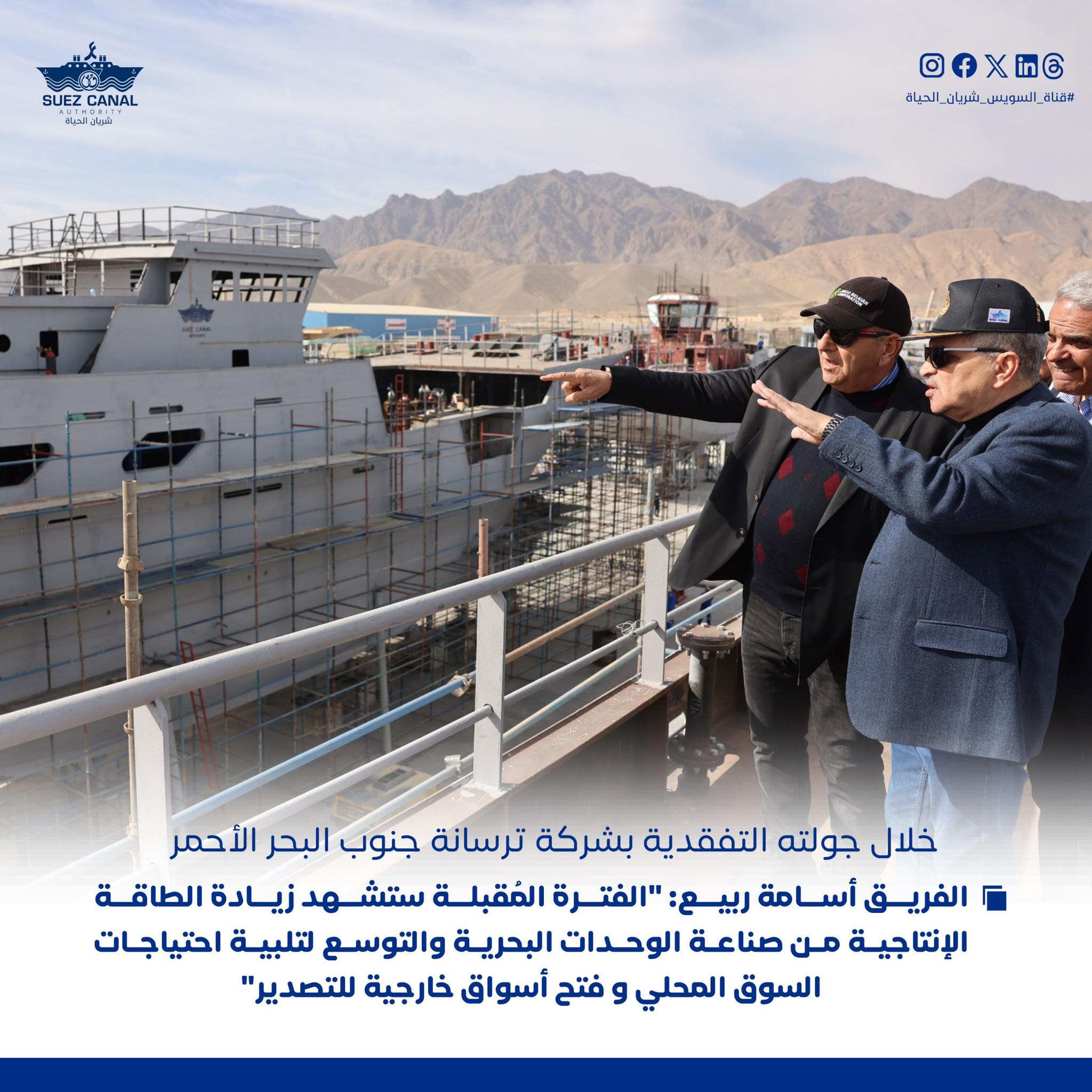 تفقد الفريق أسامة ربيع رئيس هيئة قناة السويس، أعمال بناء الوحدات البحرية المختلفة الجاري بناؤها بشركة ترسانة جنوب البحر الأحمر، للوقوف على معدلات الإنجاز والجداول الزمنية للتنفيذ، ومتابعة سير العمل وأعمال التجهيزات بمصنعي اليخوت السياحية بشركة قناة السويس للقوارب الحديثة بسفاجا.