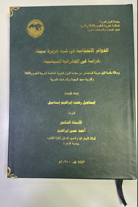 “الدوائر الانتخابية في شبه جزيرة سيناء (دراسة في الجغرافيا السياسية)”، وذلك بإشراف الدكتور أحمد حسن إبراهيم، أستاذ الجغرافيا والبيئة بكلية الآداب – جامعة القاهرة.
