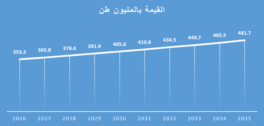 يوضح الجدول توقعات نمو سوق وقود الطائرات خلال الفترة من 2026 إلى 2035، حيث يشهد الطلب اتجاهًا تصاعديًا مستمرًا دون أي تراجع، يبدأ حجم السوق عند نحو 353.3 مليون طن في عام 2026، ويرتفع تدريجيًا ليصل إلى 481.7 مليون طن بحلول عام 2035، ما يعكس نموًا تراكميًا كبيرًا خلال عشر سنوات.