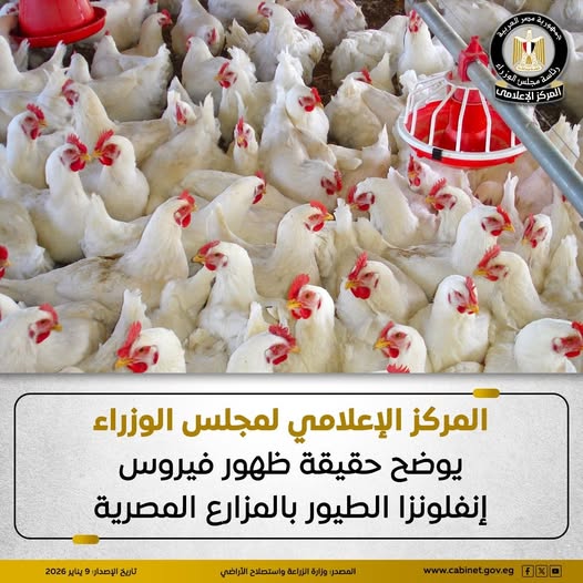 وأوضح المركز الإعلامي أنه بالتواصل مع وزارة الزراعة واستصلاح الأراضي، أفادت بعدم رصد أي حالات إصابة بإنفلونزا الطيور في أي من المزارع المصرية.