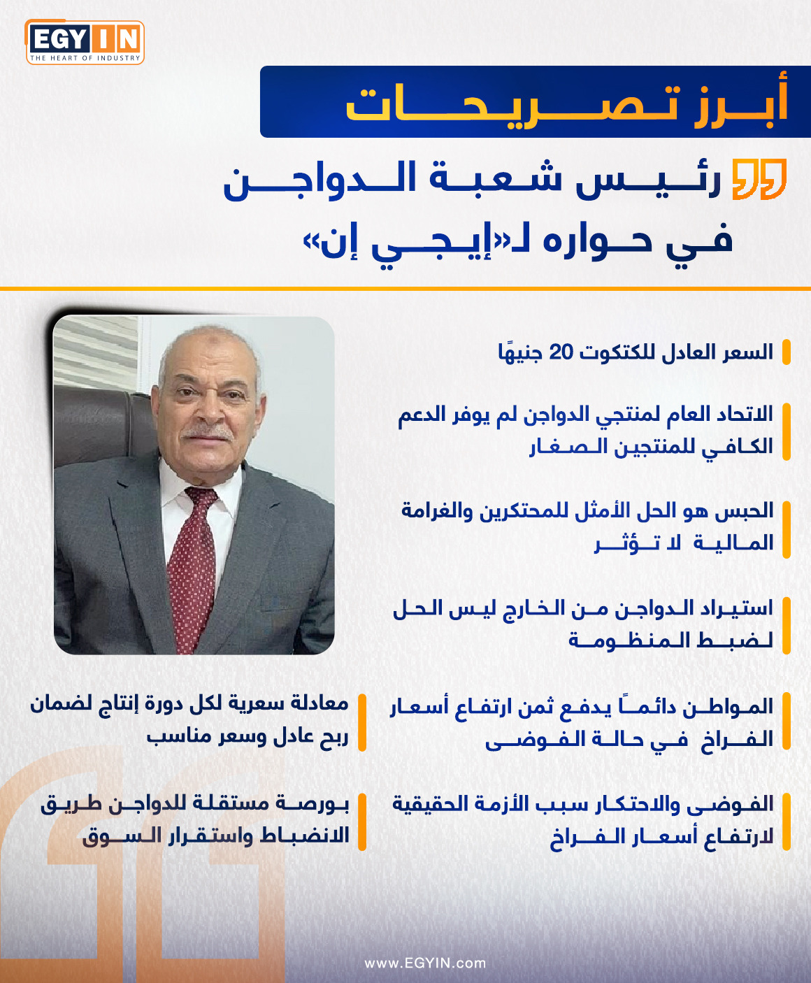 ينشر موقع "إيجي إن"، إنفوجرافًا، لأبرز تصريحات رئيس شعبة الدواجن، خاصة بعدما أصبح سعر كيلو الدواجن حديث المصريين اليومي، بعد ارتفاع متكرر في الأسعار، دون أسباب أو مبررات منطقية، وهو ما يؤثر على حياة المصريين بشكل يومي.