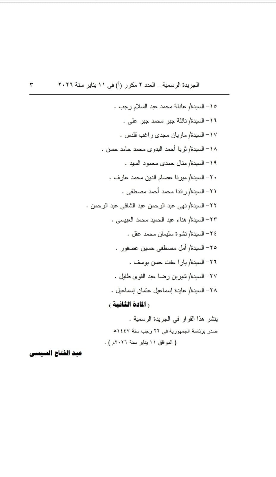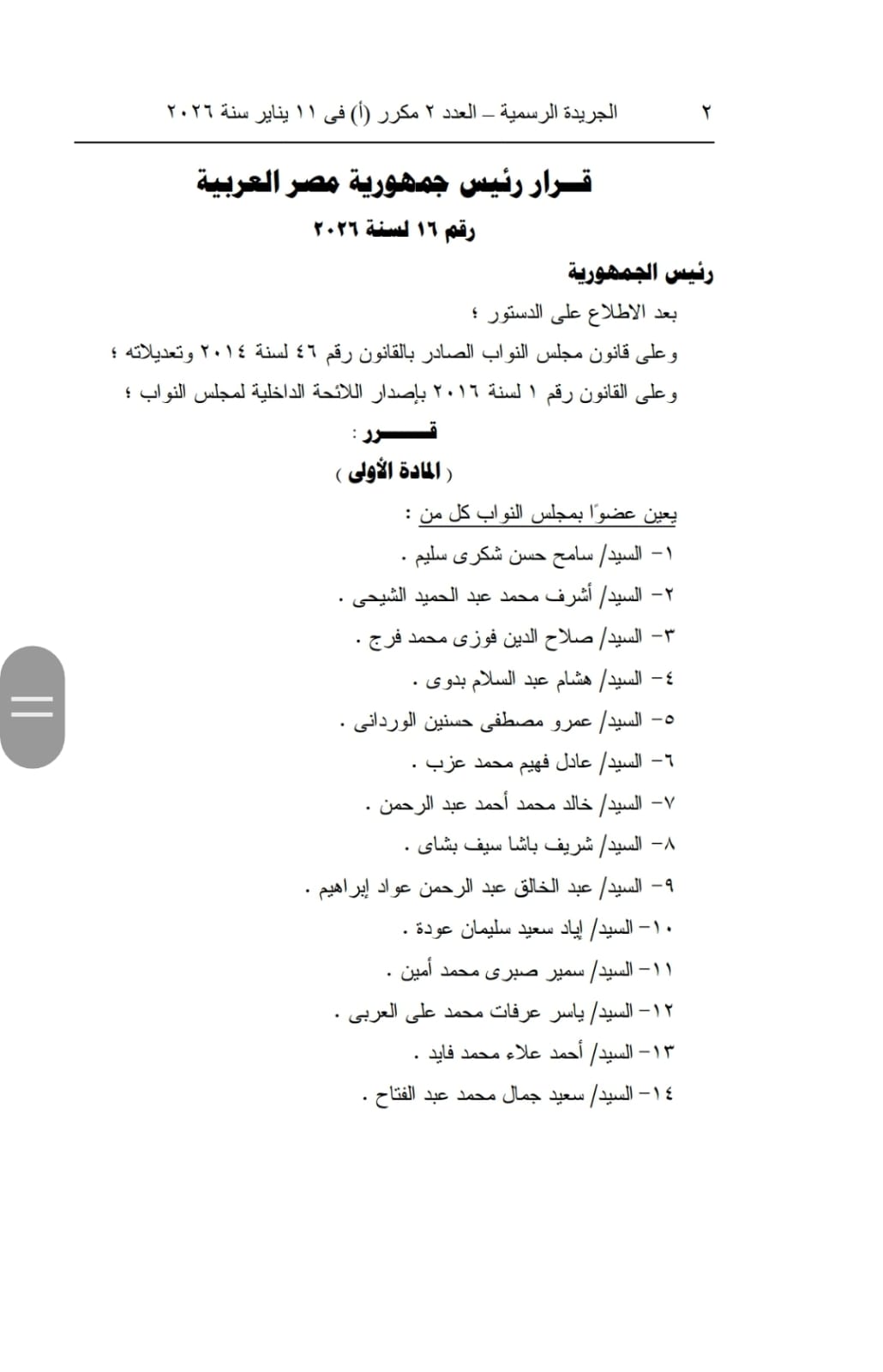 وفي سياق متصل، كانت الجريدة الرسمية قد نشرت في عددها الصادر اليوم الأحد قرار رئيس الجمهورية رقم 16 لسنة 2026، والذي تضمن في مادته الأولى أسماء المعينين في مجلس النواب.