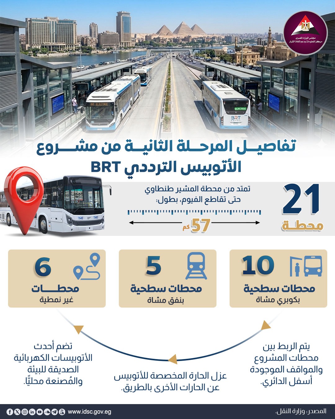 كشف مركز المعلومات ودعم اتخاذ القرار بمجلس الوزراء، عبر إنفوجراف رسمي، تفاصيل المرحلة الثانية من مشروع الأتوبيس الترددي السريع BRT على الطريق الدائري، والتي تمتد بطول 57 كيلومترًا، وتضم 21 محطة، تبدأ من محطة المشير طنطاوي وحتى تقاطع الفيوم.