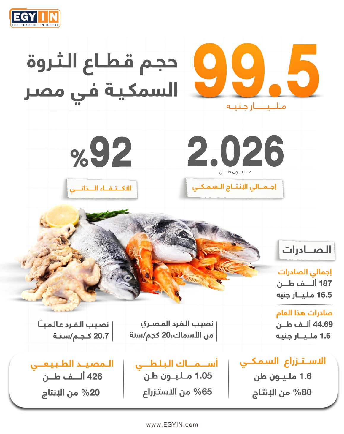 وأضاف “مصيلحي” في تصريحات خاصة لـ"إيجي إن"، أن حجم الاستثمارات في قطاع الثروة السمكية بلغ نحو 99.5 مليار جنيه خلال 2025، مؤكدًا أن الإنتاج المحلي يوفر ما يقرب من 20 كجم سنويًا من الأسماك للمستهلك المصري بنسبة اكتفاء ذاتي تصل إلى 92%، مقارنة بمتوسط نصيب الفرد عالميًا البالغ 20.7 كجم سنويًا، وفقًا لتقرير منظمة الأغذية والزراعة للأمم المتحدة (فاو) لعام 2025.