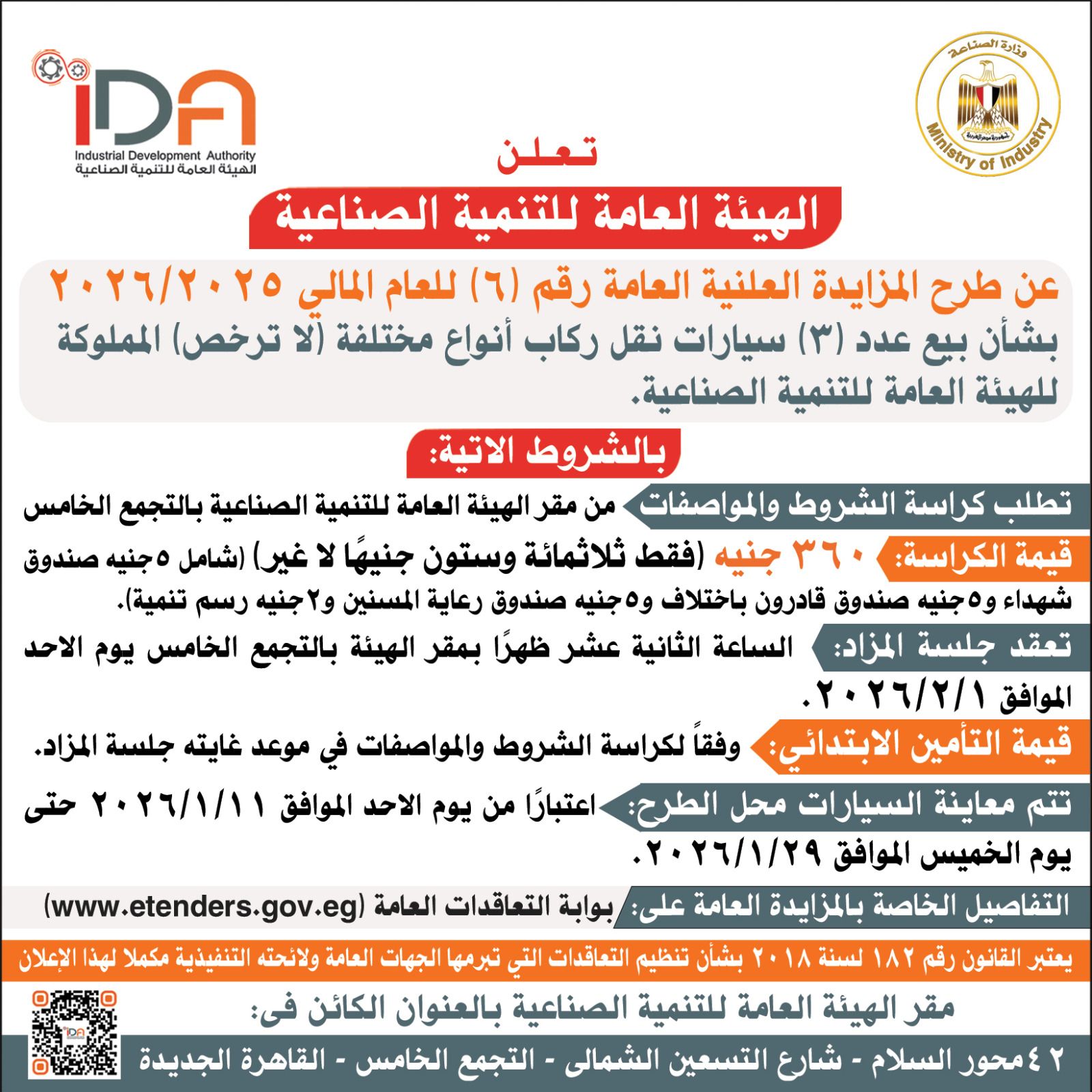 أعلنت الهيئة العامة للتنمية الصناعية عن طرح المزايدة العلنية العامة رقم (6) للعام المالي 2025/2026 بشأن بيع عدد (3) سيارات نقل ركاب أنواع مختلفة (لا ترخص) المملوكة للهيئة العامة للتنمية الصناعية.