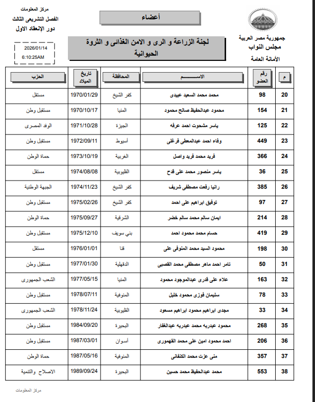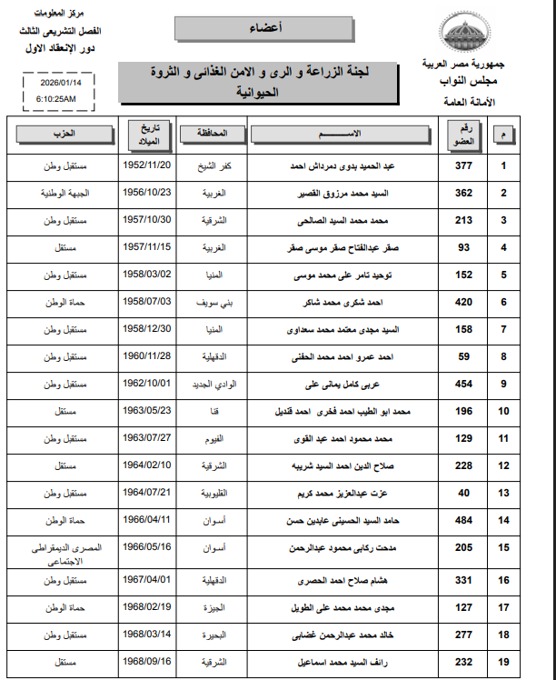 أعلن مجلس النواب انضمام 41 عضوًا إلى لجنة الزراعة والري والأمن الغذائي والثروة الحيوانية، في إطار تشكيل اللجان النوعية بالمجلس.