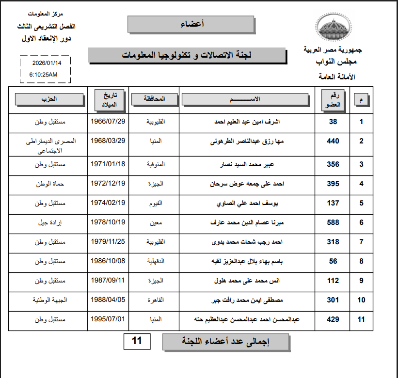 أعلن مجلس النواب المصري برئاسة المستشار هشام بدوي، اليوم الأربعاء 14 يناير 2026، عن تشكيل اللجان الداخلية خلال الفصل التشريعي الثالث لدور الانعقاد الأول، ومن بينها لجنة الاتصالات وتكنولوجيا المعلومات التي تضم 11 عضوًا يمثلون مختلف محافظات مصر وتوجهات سياسية متعددة، وتضم اللجنة نوابًا من أحزاب مستقبل وطن، المصرى الديمقراطي الاجتماعي، حماة الوطن، إرادة جيل، الجبهة الوطنية، بالإضافة إلى عضو مستقل، ما يعكس تنوع الخبرات والسياسات الممثلة في صناعة القرارات التشريعية المتعلقة بالقطاع التكنولوجي.