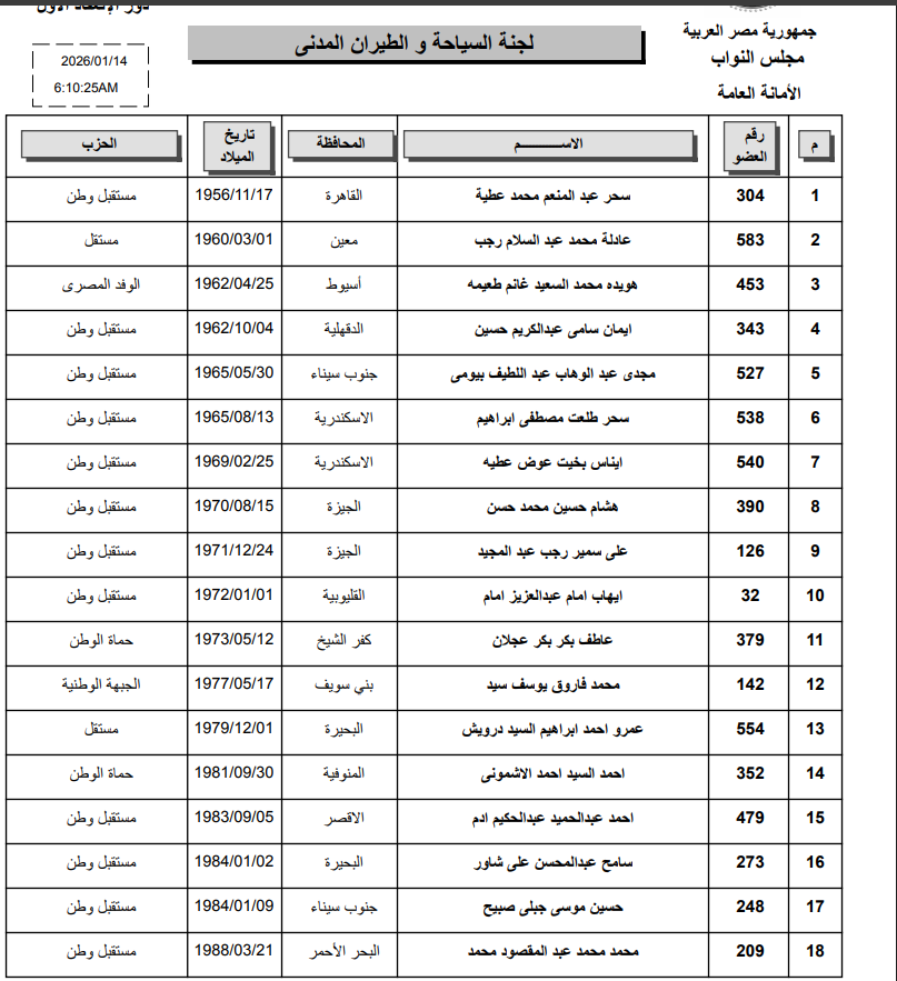 أعلن مجلس النواب المصري برئاسة المستشار هشام بدوي، اليوم الأربعاء الـ14 من يناير 2026، تشكيل اللجان الداخلية خلال الفصل التشريعي الثالث لدور الانعقاد الأول، ومن بينها لجنة السياحة والطيران المدني، والتي تضم 18 عضوًا يمثلون محافظات مختلفة وتوجهات سياسية متنوعة، من أحزاب مستقبل وطن، وحماة الوطن، والجبهة الوطنية، والوفد المصري، إضافة إلى أعضاءٍ مستقلين.
