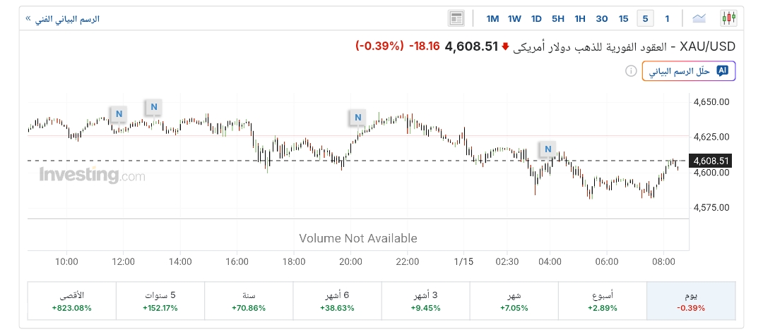 وسجلت عقود الذهب الآجلة، تسليم فبراير، تراجعًا بنسبة 0.5%، لتسجل الآن نحو 4,609 دولارًا للأوقية، بعدما افتتحت تداولات اليوم عند المستوى 4,635 دولارًا للأوقية، وفقًا لـ«ياهو فايننس».