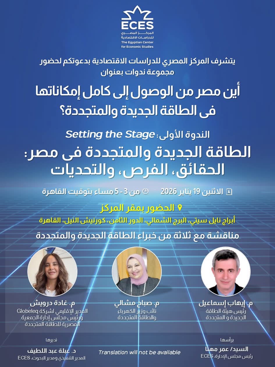 أعلن المركز المصري للدراسات الاقتصادية تنظيم أولى ندواته ضمن سلسلة بعنوان "أين مصر من الوصول إلى كامل إمكاناتها في الطاقة الجديدة والمتجددة؟"، يوم الاثنين الموافق 19 يناير 2026 من الساعة 3 إلى 5 مساءً بمقر المركز في أبراج نايل سيتي – البرج الشمالي – الدور الثامن – كورنيش النيل بالقاهرة.