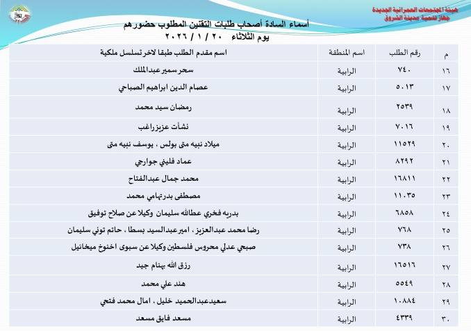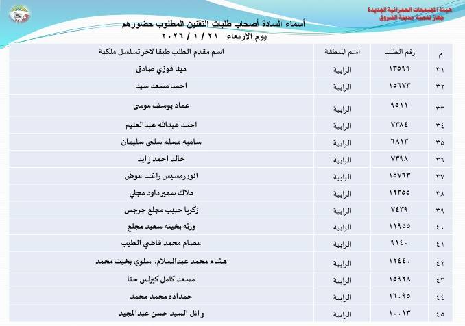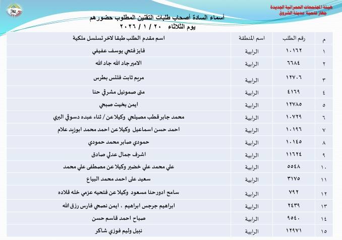 وقال الجهاز، إنه سيتم الإعلان تباعًا عن طلبات التي يتم اعتمادها من اللجنة الرئيسية مرفق بعدد 6 كشوف، موضحًا جهاز المدينة، أن هيئة المجتمعات العمرانية الجديدة، اعتمدت آلية وضوابط التعامل مع حائزي الأراضي بالمناطق المضافة للمدينة، وذلك لاستكمال إجراءات التقنين مع المعتمد طلباتهم من اللجنة الرئيسية.