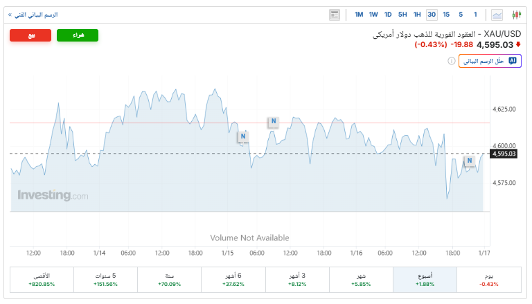 استقرت أسعار الذهب خلال تعاملات اليوم السبت 17 يناير 2026، بالتزامن مع العطلة الأسبوعية للبورصات العالمية، وذلك بعد أن اختتمت جلسة تداولات الأسبوع على تراجع بنسبة 0.4%، بينما حققت مكاسب أسبوعية للأسبوع الثاني على التوالي بنسبة 1.9%.