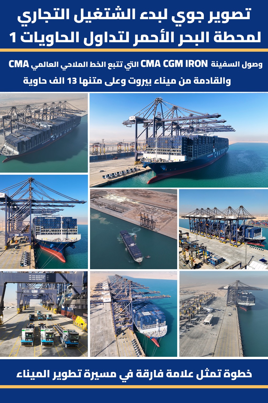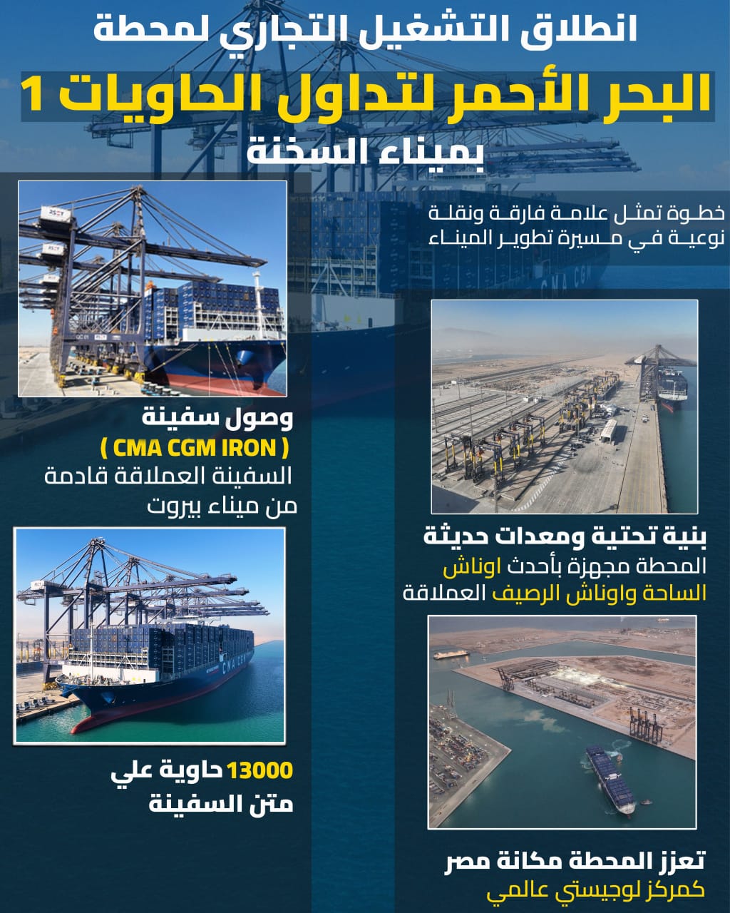 افتتحت محطة البحر الأحمر لتداول الحاويات قم 1 (RSCT) بميناء السخنة، بالتزامن مع ووصول السفينة CMA CGM IRON التي تتبع الخط الملاحي العالمي CMA والقادمة من ميناء بيروت وعلى متنها 13 ألف حاوية إلى أرصفة المحطة في خطوة تمثل علامة فارقة بمسيرة تطوير الميناء.