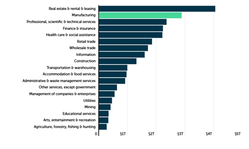 أظهرت بيانات حديثة مقارنة بين مساهمة القطاعات الاقتصادية المختلفة في الناتج المحلي الإجمالي للولايات المتحدة، أن قطاع العقارات والتأجير يتصدر قائمة القطاعات الأكبر مساهمة، بقيمة تقترب من 5 تريليونات دولار، يليه قطاع التصنيع بنحو 3 تريليونات دولار.