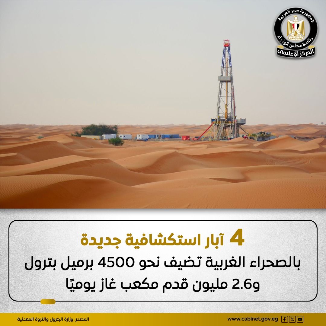 أكد المركز الإعلامي لمجلس الوزراء، أن نتائج حفر 4 آبار استكشافية جديدة بالصحراء الغربية لشركات خالدة وثروة وبرج العرب، أسفرت عن إضافة إنتاجية تبلغ قرابة 4500 برميل بترول خام يوميًا، و2.6 مليون قدم مكعب غاز يوميًا، وذلك في إطار جهود وزارة البترول والثروة المعدنية لتعظيم الإنتاج المحلي وتقليل الفاتورة الاستيرادية من خلال تكثيف أعمال الاستكشاف للبترول والغاز،