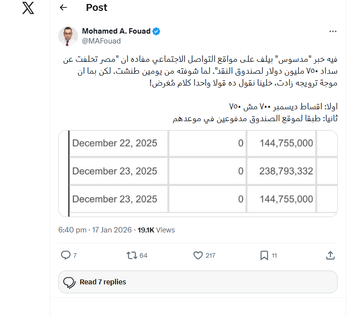 وأوضح الخبير الاقتصادي عبر صفحته الرسمية على موقع التواصل الاجتماعي "إكس": أن أقساط السداد على مصر في شهر ديسمبر تبلغ 700 مليون دولار وليست 750 مليون دولار، مؤكدًا أنه وفقا لموقع الصندوق فإن مصر سددت الأقساط في موعدها.
