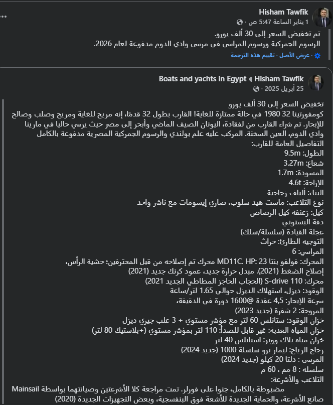 بعد رحلة بحرية طويلة شقت مياه المتوسط من اليونان إلى مصر، أعلن هشام توفيق، وزير قطاع الأعمال العام السابق، ورئيس نادي هليوبوليس، عن عرض يخته الخاص للبيع في مصر، مع تخفيض 30 ألف يورو من السعر لتسهيل عملية البيع.