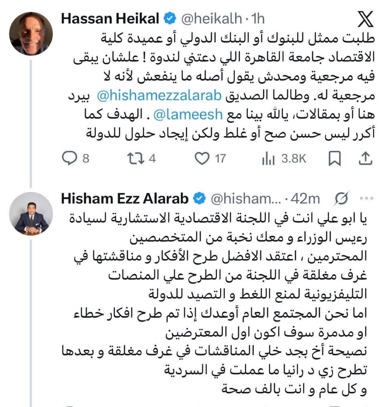 «هيكل وعز العرب» يشعلان جدلًا على "إكس" حول كواليس صناعة القرار الاقتصادي