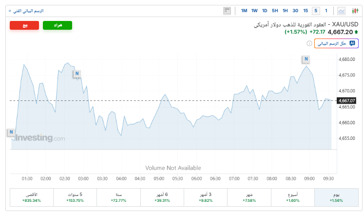 وفي المقابل، صعدت الأسعار الفورية للذهب بنسبة 1.5%، بعدما تخطت ولأول مرة حاجز 4690 دولار للأوقية مع افتتاح الجلسة، لتلامس مستوى الـ 4700 دولار للأوقية، وتتداول حاليًا عند 4,667 دولارات للأوقية، بعدما افتتحت التداولات عند 4,595 دولارًا، مسجلة أعلى مستوى لها عند 4,690 دولارًا، وأدنى مستوى عند 4,595 دولارًا، بحسب موقع «إنفيستينج».