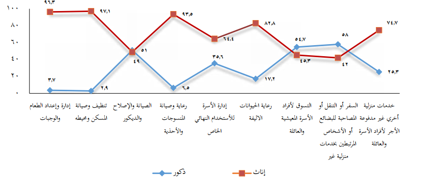 ففي إعداد الطعام والوجبات، بلغت نسبة مشاركة الإناث 96.3% مقابل 3.7% فقط للذكور، بينما سجلت أعمال تنظيف وصيانة المسكن مشاركة نسائية بلغت 97.1% مقابل 2.9% للذكور، ما يعكس استمرار التقسيم التقليدي للأدوار داخل الأسرة.