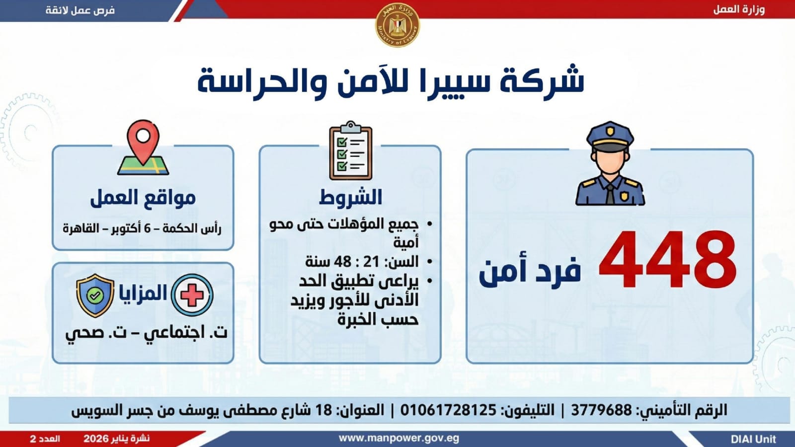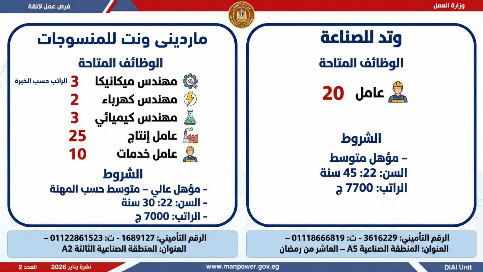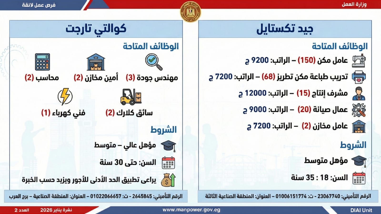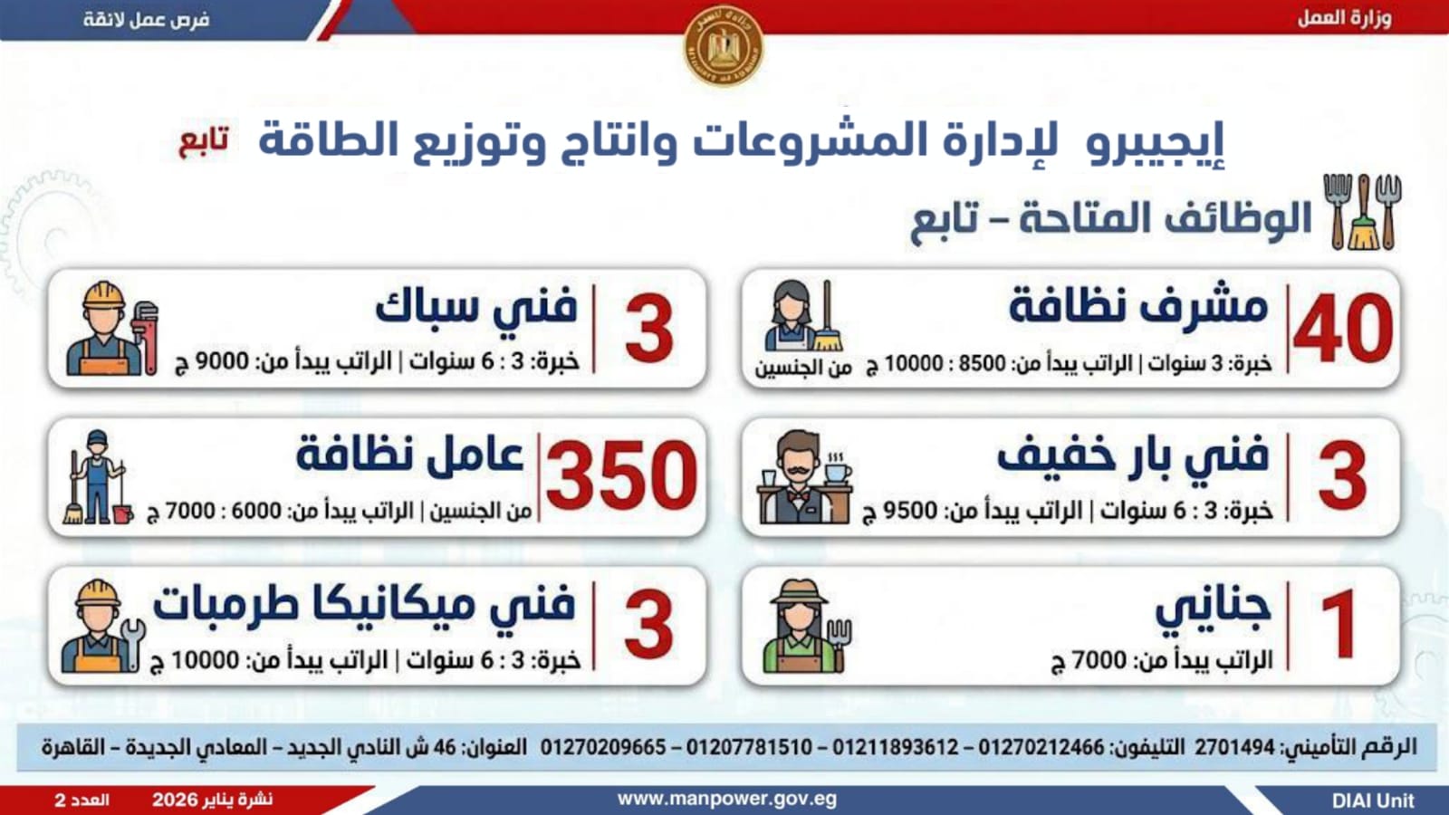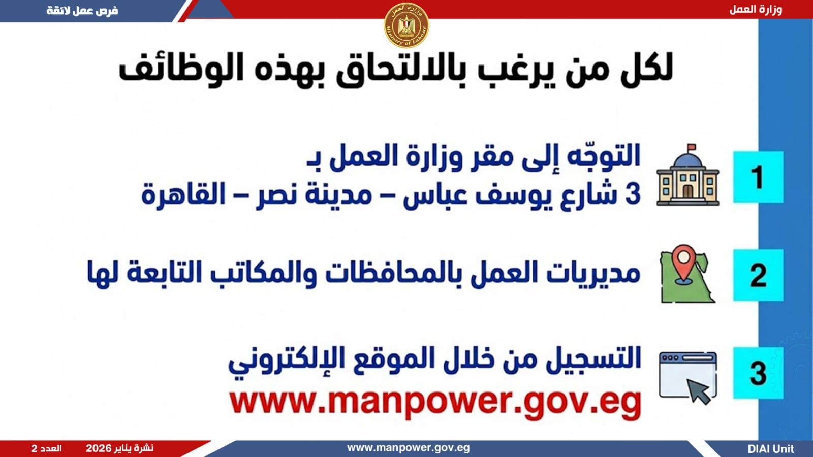 ولضمان جدية ومصداقية هذه الفرص، وجه وزير العمل مديريات المحافظات بتكثيف المتابعة الميدانية والتحقق من استلام العمال لمهامهم رسميًا، ودعت الوزارة الشباب الراغب في الالتحاق بهذه الوظائف إلى التقديم عبر مسارات ميسرة، سواء من خلال الموقع الرسمي للوزارة، أو التوجه المباشر لمقر الإدارة العامة للتشغيل بمدينة نصر، أو مديريات العمل بالمحافظات، مؤكدة استمرار الدولة في تقديم برامج تدريب مهني مجانية تؤهل الكوادر الشابة لسد الفجوة بين المهارات المكتسبة واحتياجات سوق العمل الحقيقية.