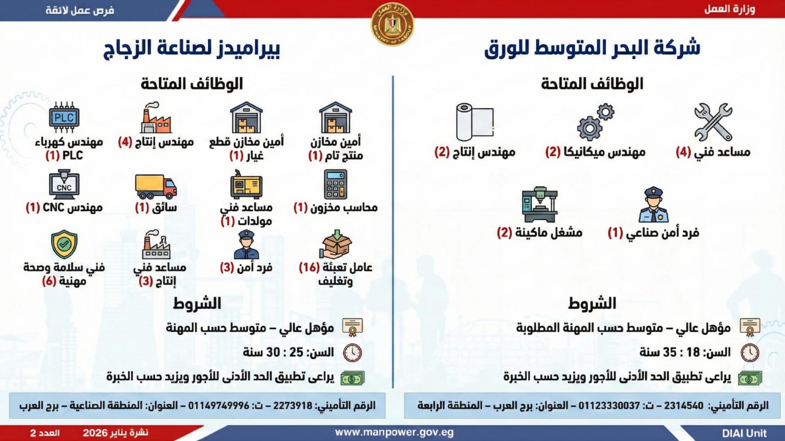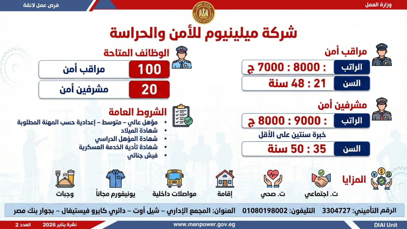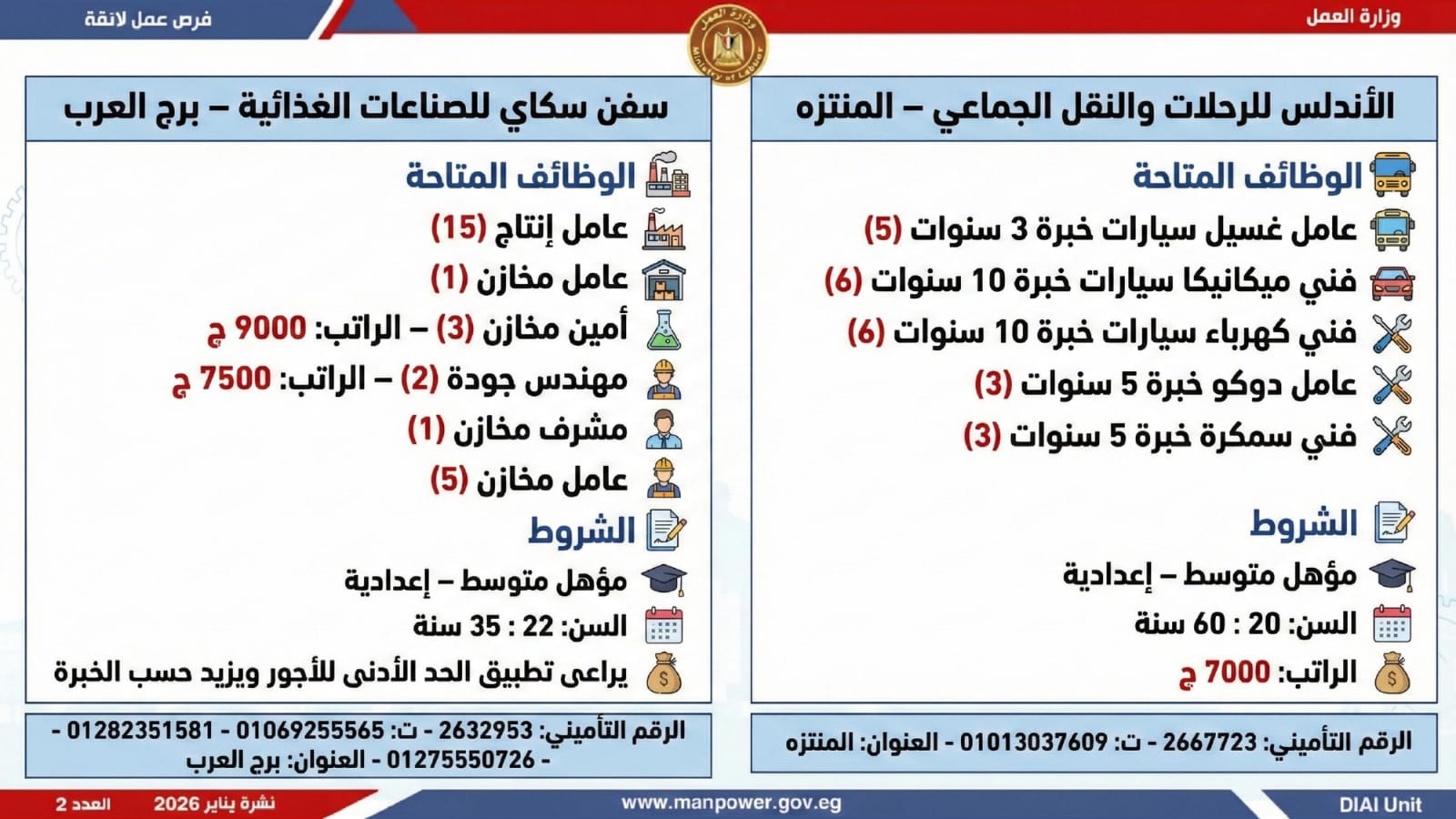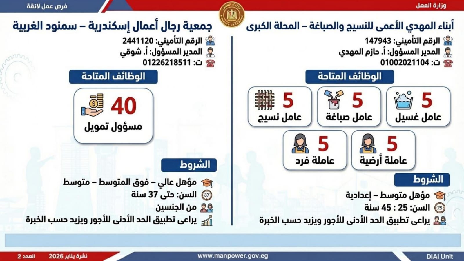 ولضمان جدية ومصداقية هذه الفرص، وجه وزير العمل مديريات المحافظات بتكثيف المتابعة الميدانية والتحقق من استلام العمال لمهامهم رسميًا، ودعت الوزارة الشباب الراغب في الالتحاق بهذه الوظائف إلى التقديم عبر مسارات ميسرة، سواء من خلال الموقع الرسمي للوزارة، أو التوجه المباشر لمقر الإدارة العامة للتشغيل بمدينة نصر، أو مديريات العمل بالمحافظات، مؤكدة استمرار الدولة في تقديم برامج تدريب مهني مجانية تؤهل الكوادر الشابة لسد الفجوة بين المهارات المكتسبة واحتياجات سوق العمل الحقيقية.