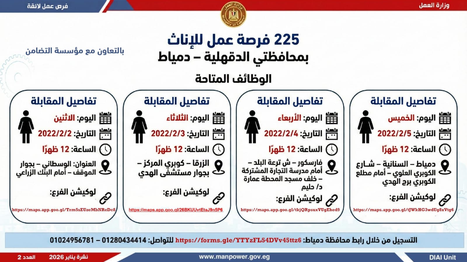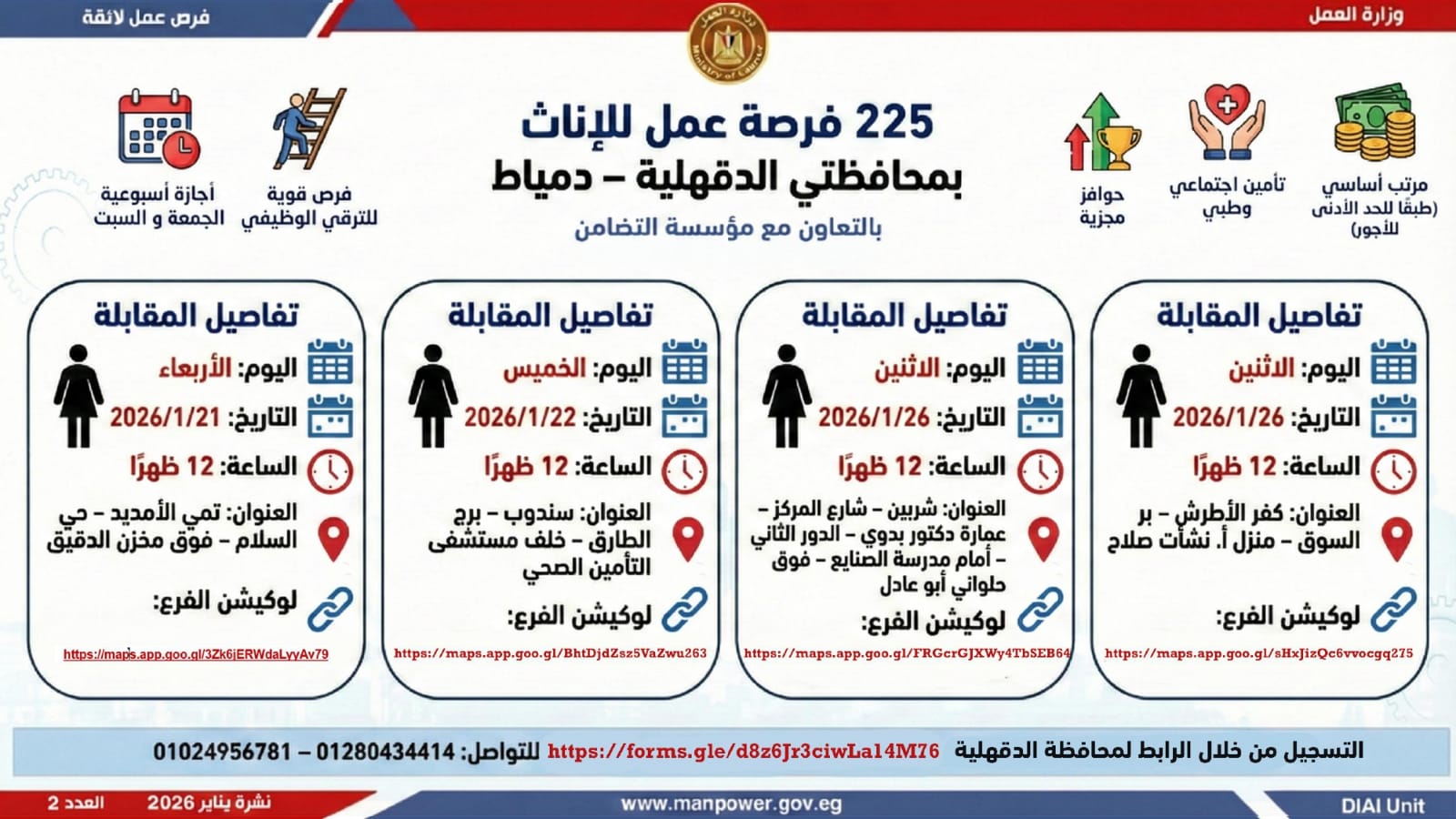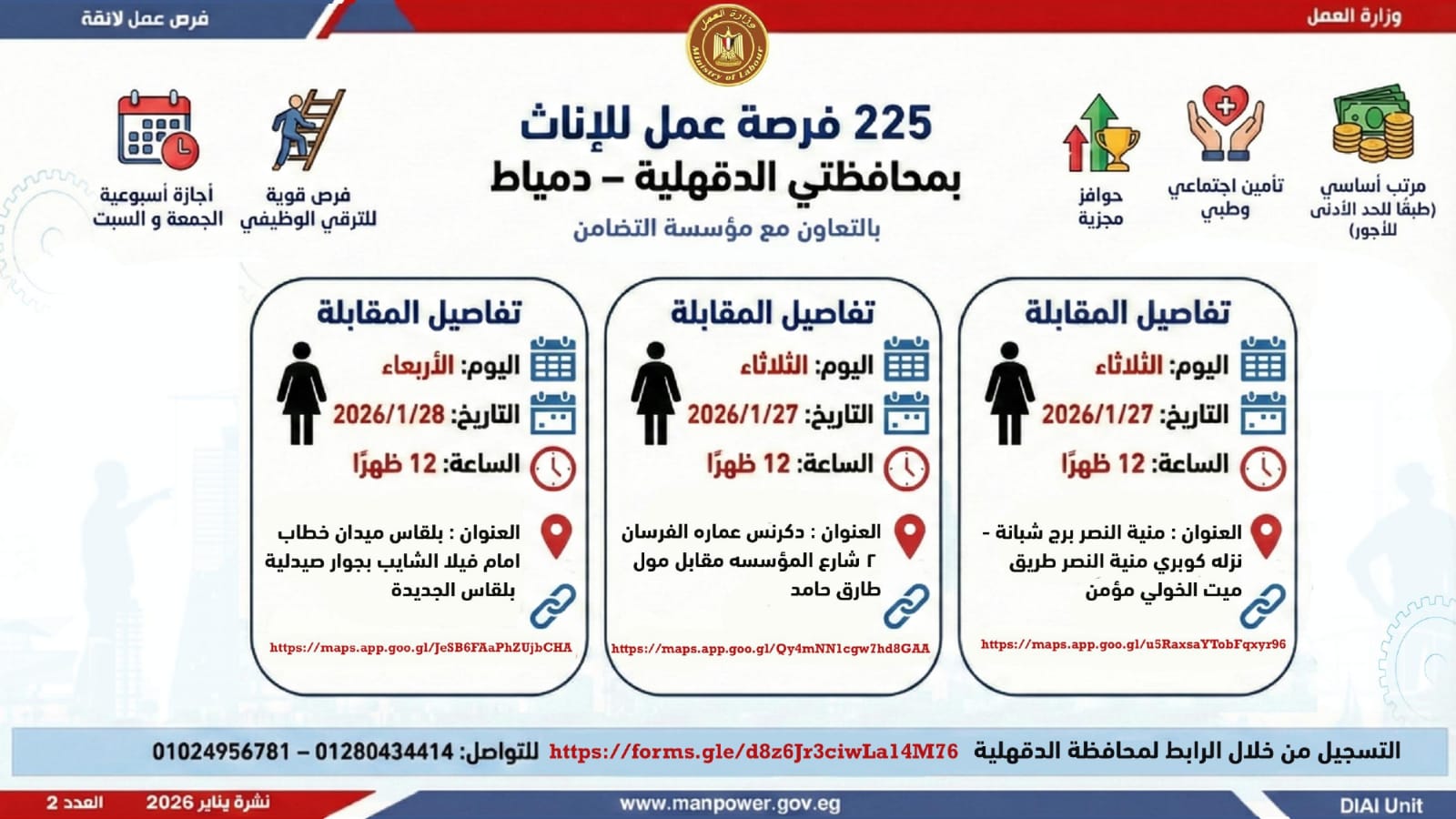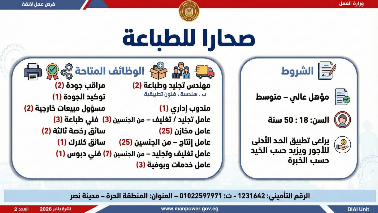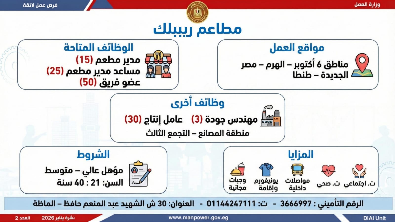 ولضمان جدية ومصداقية هذه الفرص، وجه وزير العمل مديريات المحافظات بتكثيف المتابعة الميدانية والتحقق من استلام العمال لمهامهم رسميًا، ودعت الوزارة الشباب الراغب في الالتحاق بهذه الوظائف إلى التقديم عبر مسارات ميسرة، سواء من خلال الموقع الرسمي للوزارة، أو التوجه المباشر لمقر الإدارة العامة للتشغيل بمدينة نصر، أو مديريات العمل بالمحافظات، مؤكدة استمرار الدولة في تقديم برامج تدريب مهني مجانية تؤهل الكوادر الشابة لسد الفجوة بين المهارات المكتسبة واحتياجات سوق العمل الحقيقية.