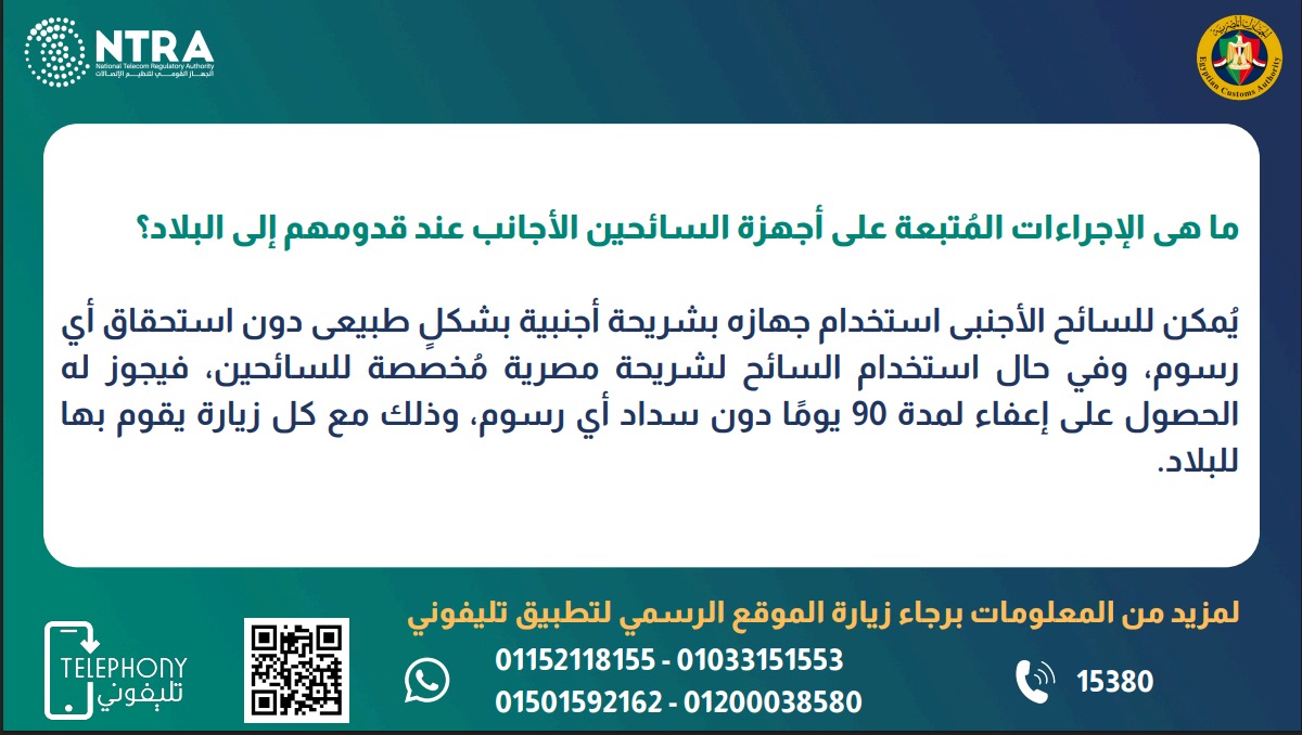 أما بالنسبة للسائحين الأجانب، فقد تم وضع تسهيلات مماثلة تسمح لهم باستخدام أجهزتهم بشريحة أجنبية بشكل طبيعي دون دفع أي رسوم، وفي حال رغبة السائح في استخدام شريحة مصرية مخصصة للسياح، يحق له الحصول على إعفاء لمدة 90 يومًا أيضًا، ويُطبّق هذا الإعفاء مع كل زيارة يقوم بها إلى البلاد، مما يعكس اهتمام الدولة بتيسير تجربة الاتصالات الرقمية لكل الزوار والمقيمين على حد سواء.