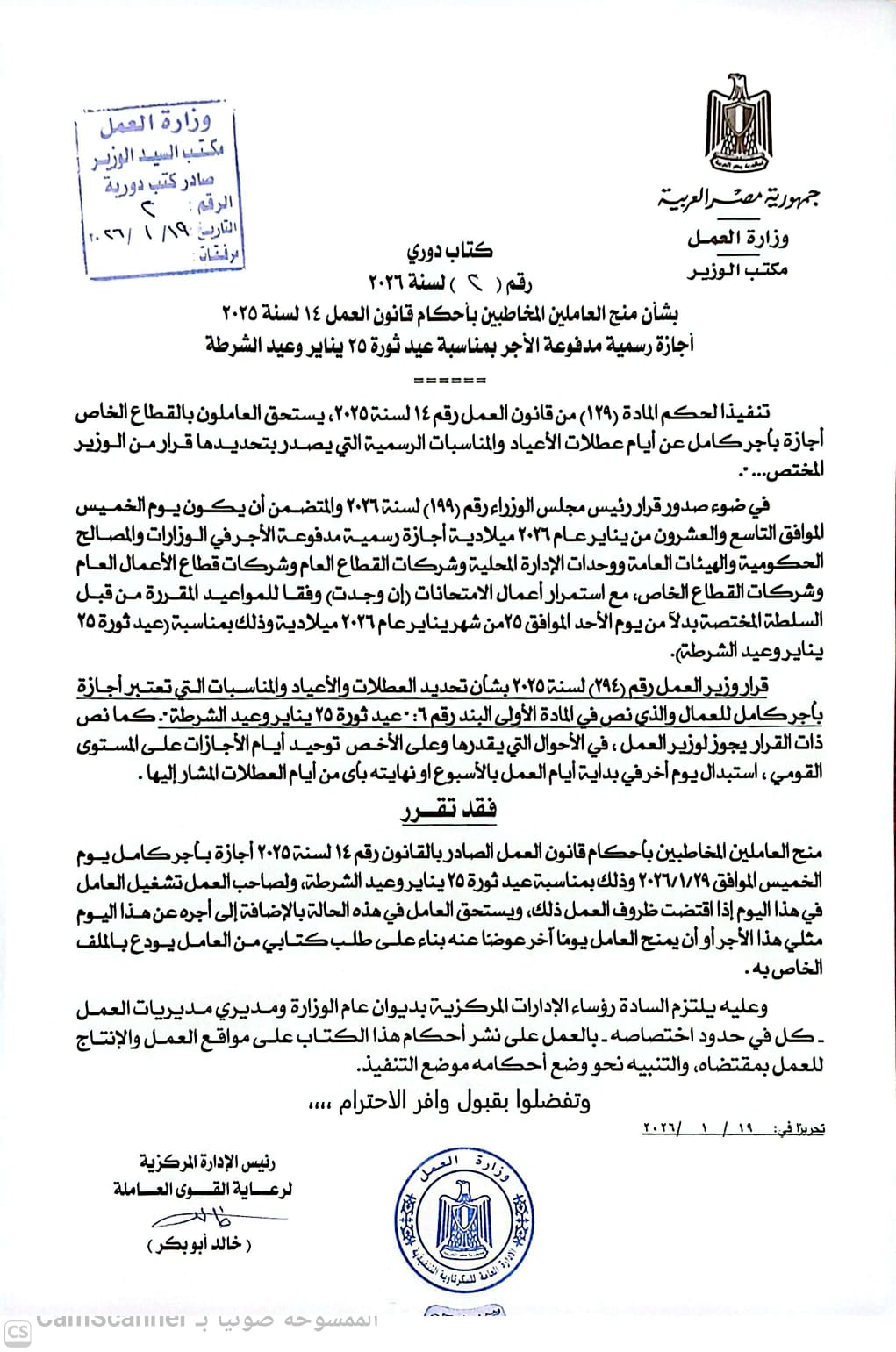 أعلن وزير العمل، محمد جبران، اليوم الثلاثاء، عن صدور الكتاب الدوري رقم (2) لسنة 2026 عن الوزارة، بشأن منح العاملين بالقطاع الخاص المخاطبين بأحكام قانون العمل رقم 14 لسنة 2025 إجازة رسمية مدفوعة الأجر، بمناسبة عيد ثورة 25 يناير وعيد الشرطة.