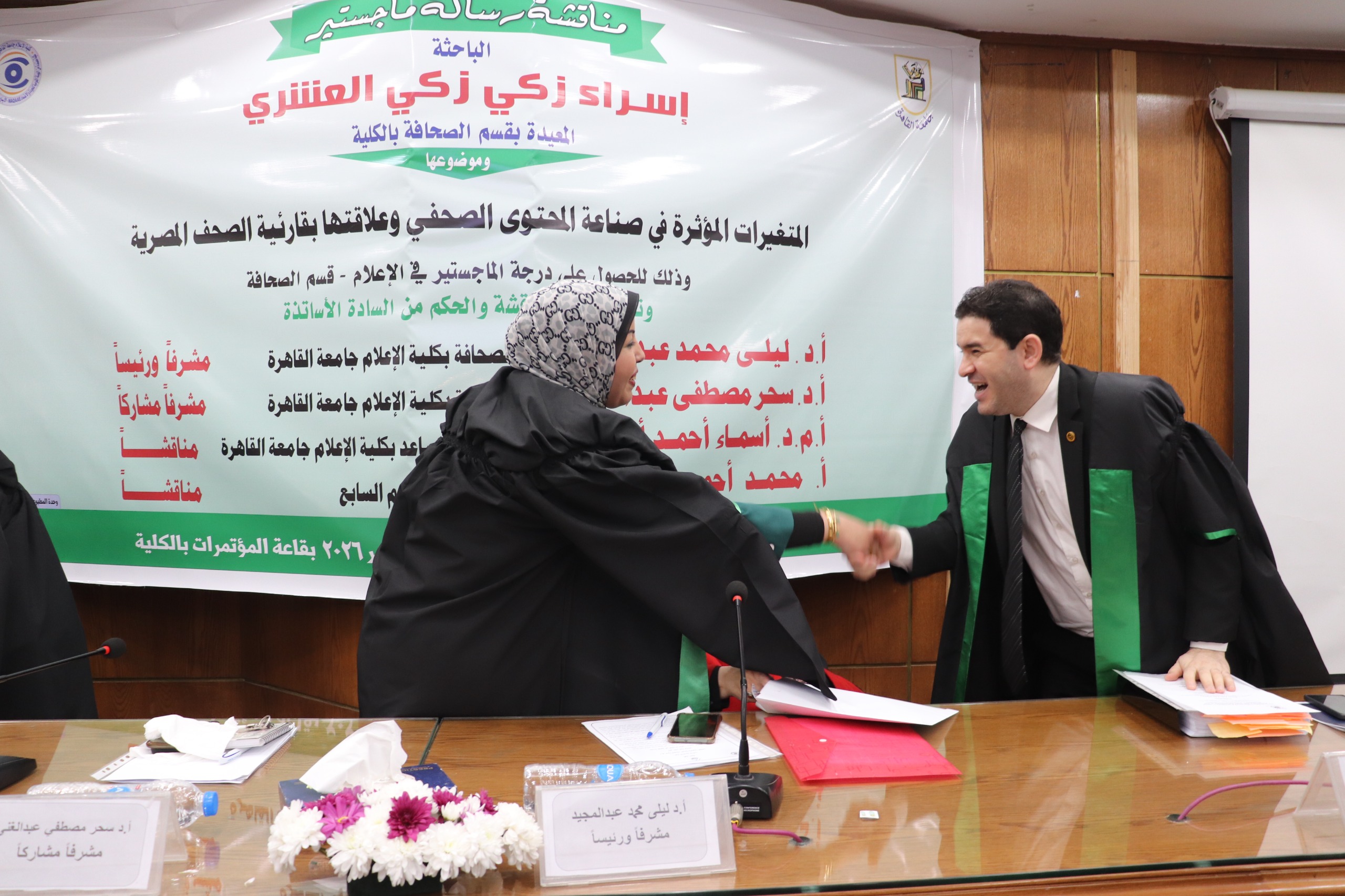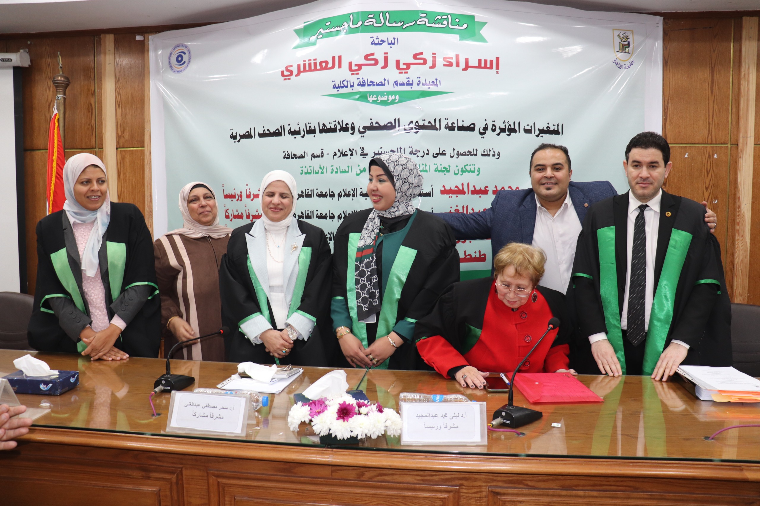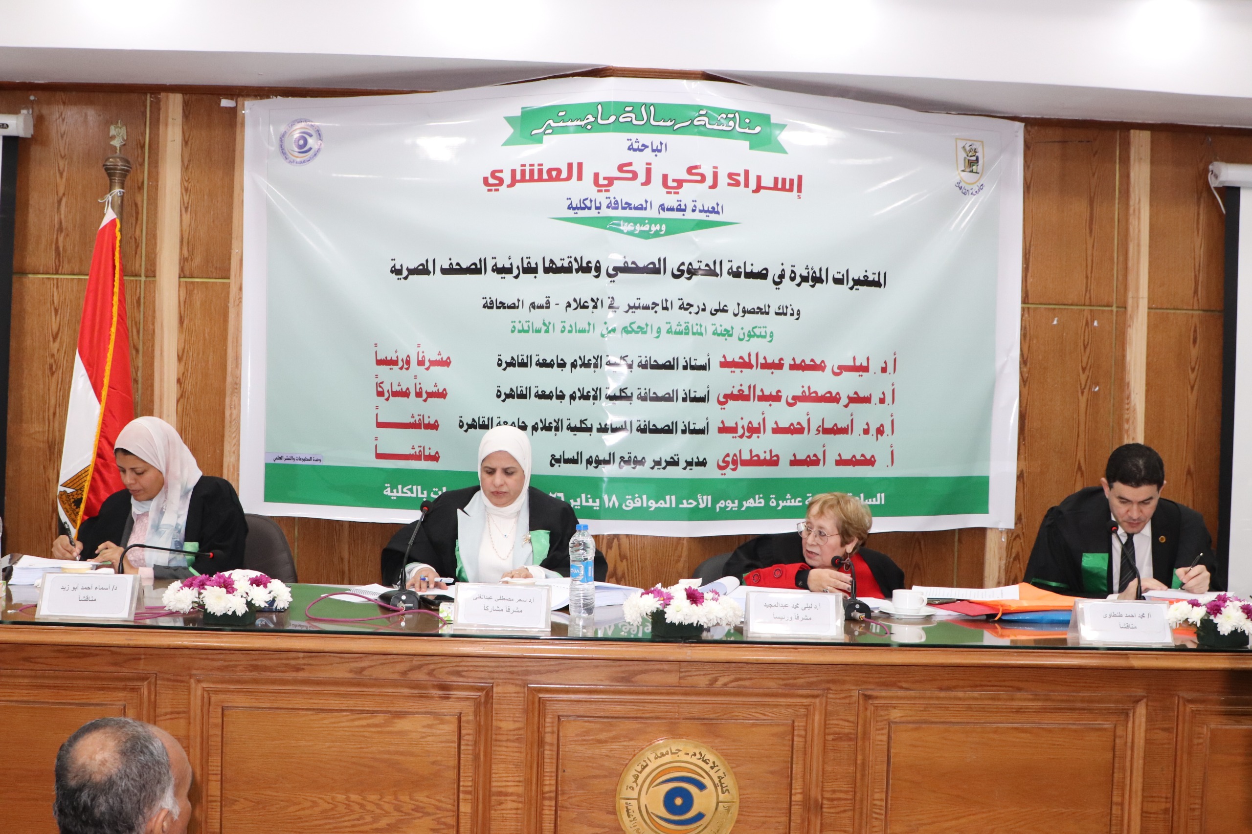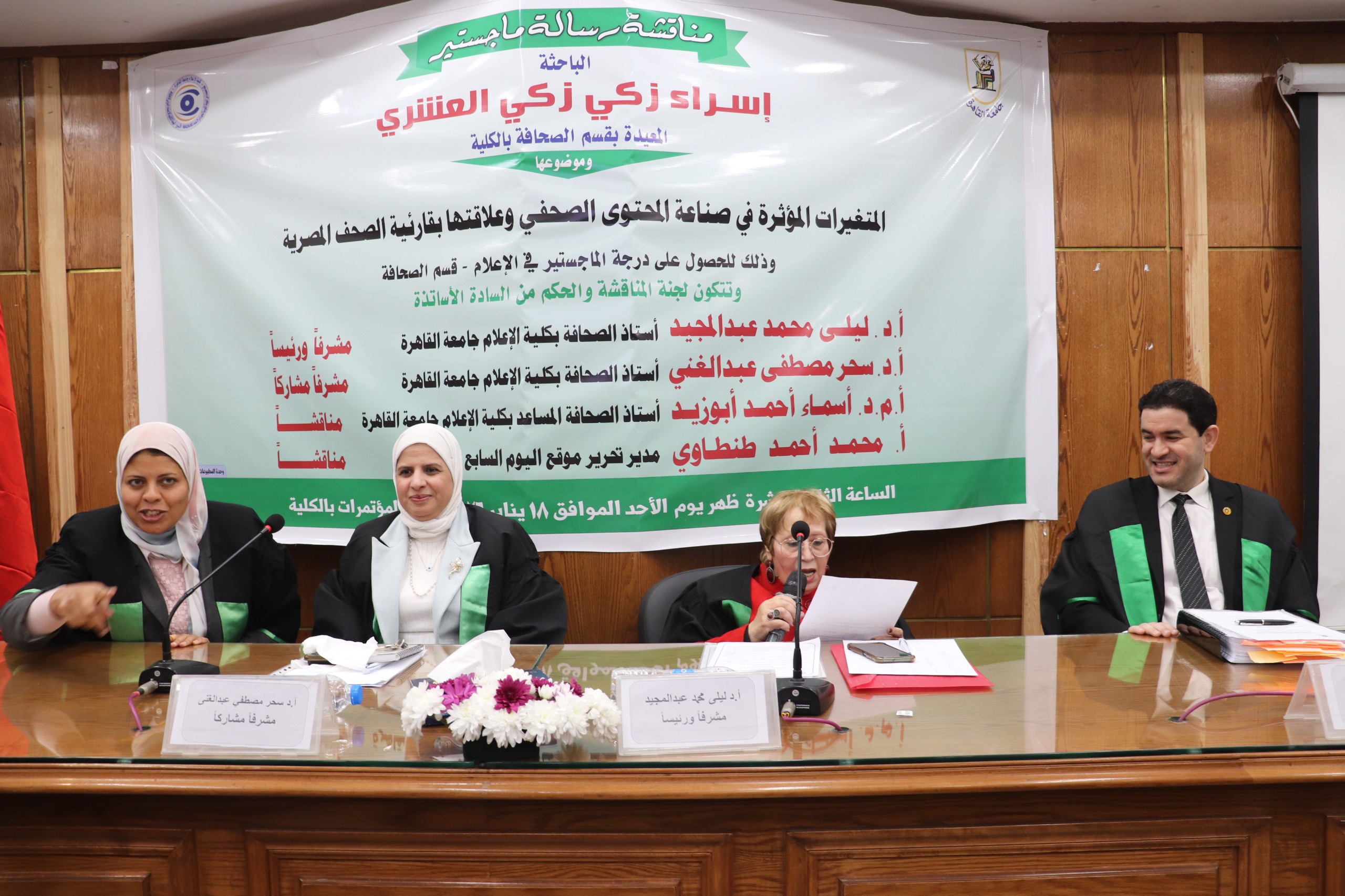 وقد جاءت لجنة المناقشة على النحو التالي، الدكتورة ليلى عبد المجيد، أستاذ الصحافة بكلية الإعلام جامعة القاهرة والعميد الأسبق للكلية، مشرفاً ورئيساً، والدكتور سحر مصطفى، أستاذ الصحافة بكلية الإعلام جامعة القاهرة، ومدير مركز بحوث ودراسات الرأي العام بالكلية، مشرفاً مشاركًا، والدكتور أسماء أبو زيد، أستاذ الصحافة المساعد بكلية الإعلام جامعة القاهرة مناقشاً، والكاتب الصحفي محمد أحمد طنطاوي، مدير تحرير موقع اليوم السابع، مناقشاً. وأشادت اللجنة بما قدمته الباحثة إسراء زكي زكي العشري، خلال رسالة الماجستير الخاصة بها، ومنحتها درجة الماجستير بتقدير امتياز.