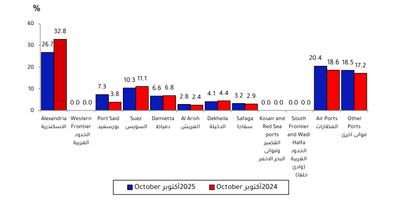صادرات مصر عبر الموانئ خلال الفترة من يناير وحتى أكتوبر 2025
