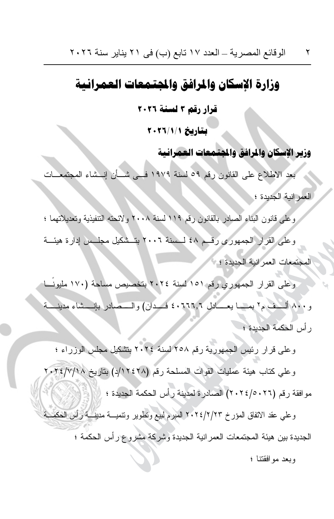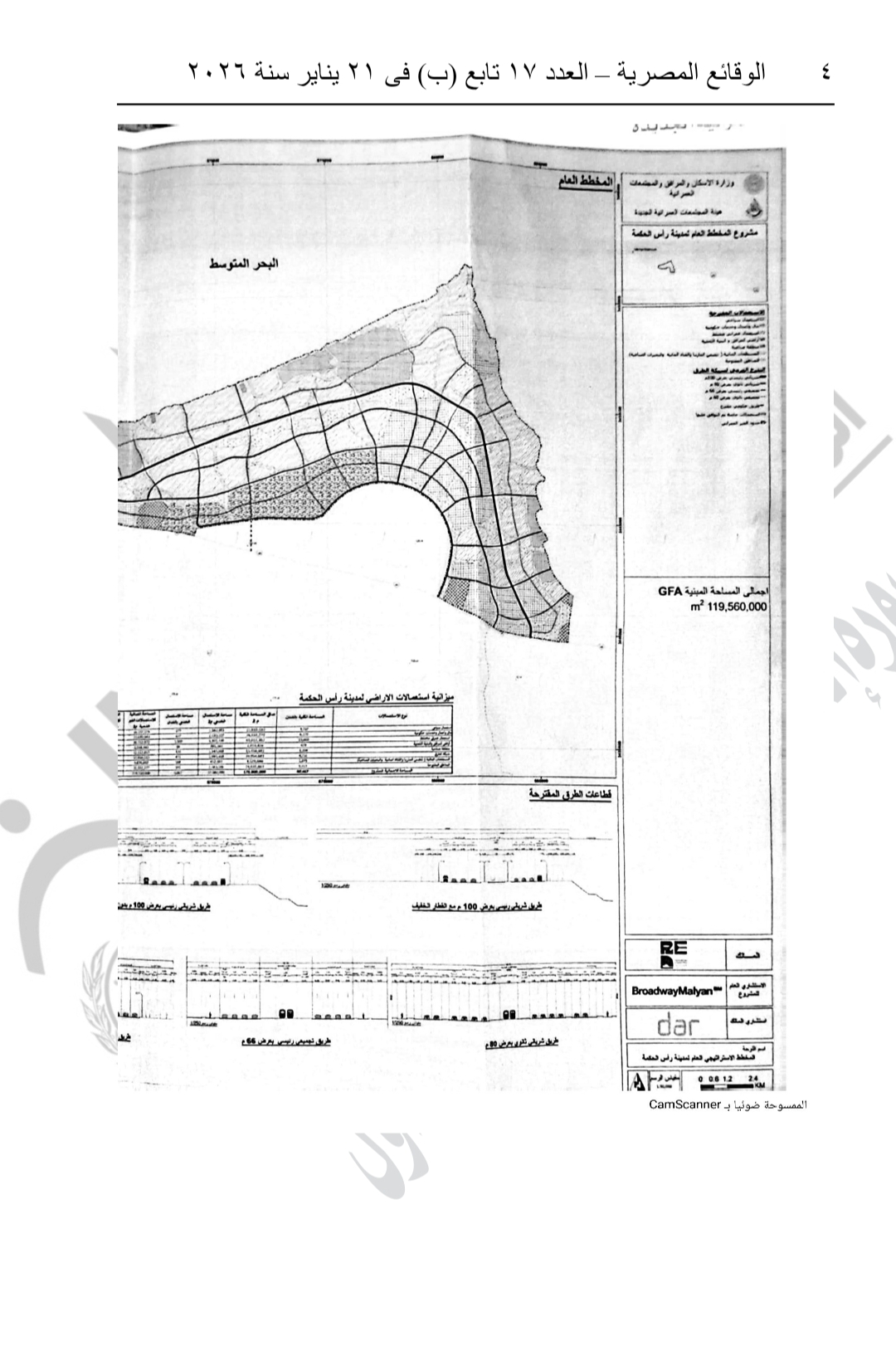 أصدر المهندس شريف الشربيني وزير الإسكان والمرافق والمجتمعات العمرانية الجديدة قرار رقم 3 لسنة 2026 باعتماد المخطط الاستراتيجي العام لمدينة رأس الحكمة الجديدة، التي تم إنشاؤها بالقرار الجمهوري رقم 151 لسنة 2024، على مساحة تصل إلى 170.8 مليون متر لما يعادل 40666.6 فدان.