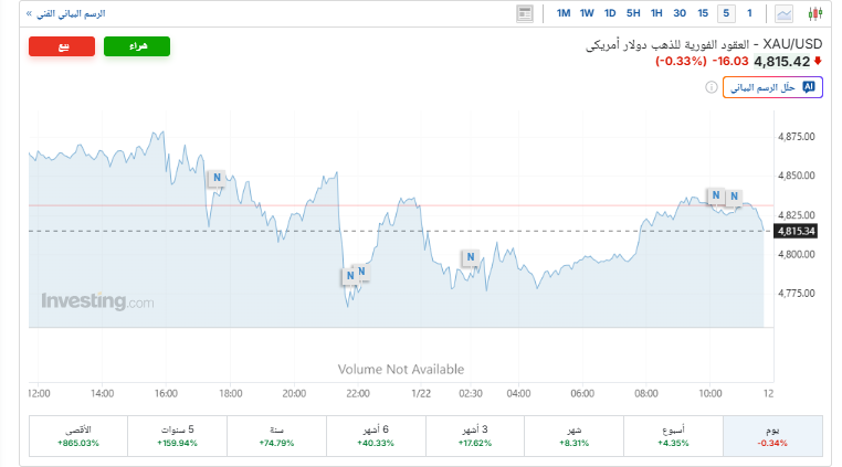 وفي المقابل، صعدت الأسعار الفورية للذهب بنسبة 0.3%، بعدما تخطت ولأول مرة حاجز 4850 دولارا للأوقية أمس، وتتداول حاليًا عند 4,815 دولارات للأوقية، بعدما افتتحت التداولات عند 4,831 دولارًا، مسجلة أعلى مستوى لها عند 4,838 دولارًا، وأدنى مستوى عند 4,772 دولارًا، بحسب موقع «إنفيستينج»