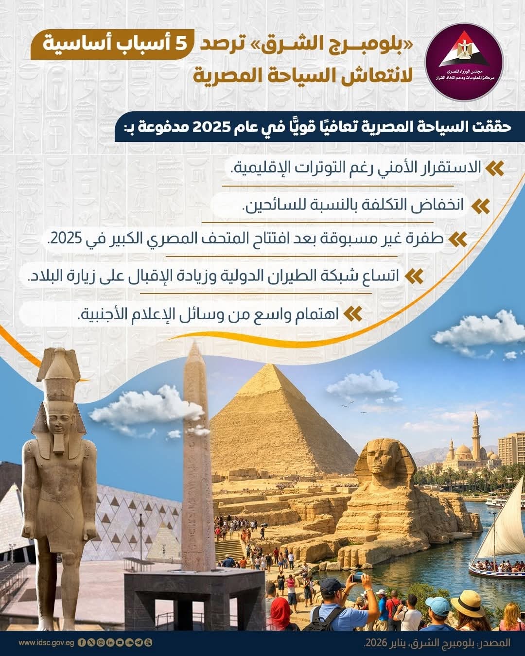 رصدت منصة «بلومبرج الشرق» 5 أسباب أساسية أسهمت في تحقيق السياحة المصرية تعافيًا قويًا خلال عام 2025، رغم التوترات الإقليمية، لتعود بقوة كأحد أهم مصادر الدخل القومي.