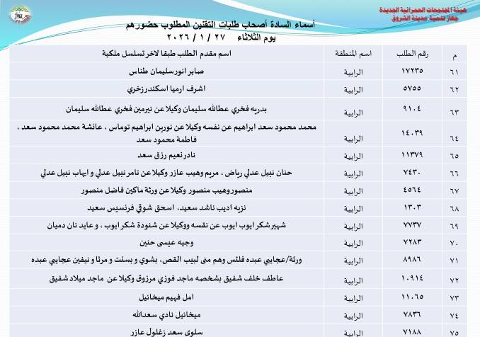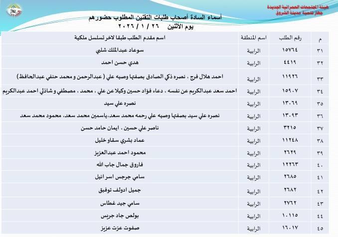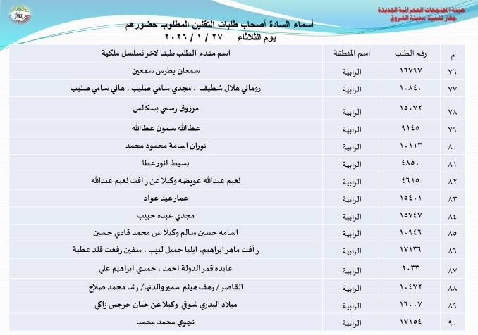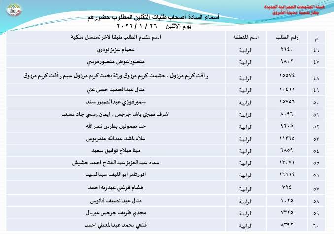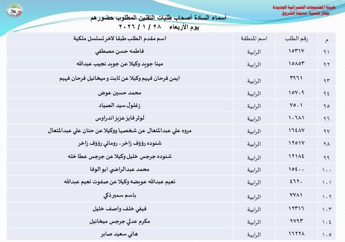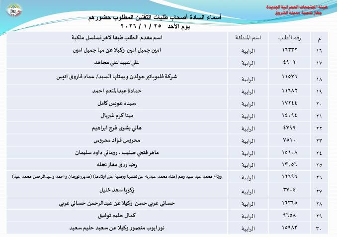 أعلنت وزارة الإسكان ممثلة في جهاز مدينة الشروق، أسماء الدفعة رقم 95 من حائزي الأراضي بالمناطق المضافة للمدينة، وعددهم 120 طلبًا.