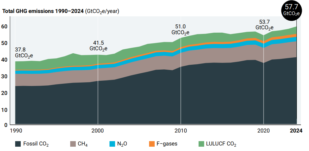 بلغت انبعاثات غازات الدفيئة العالمية 57.7 جيجا طن من مكافئ ثاني أكسيد الكربون في عام 2024، بزيادة قدرها 2.3% عن مستويات عام 2023، وتعد هذه الزيادة البالغة 2.3% في إجمالي انبعاثات غازات الدفيئة عن مستويات عام 2023 مرتفعة مقارنةً بالزيادة التي بلغت 1.6% في الفترة 2022-2023.