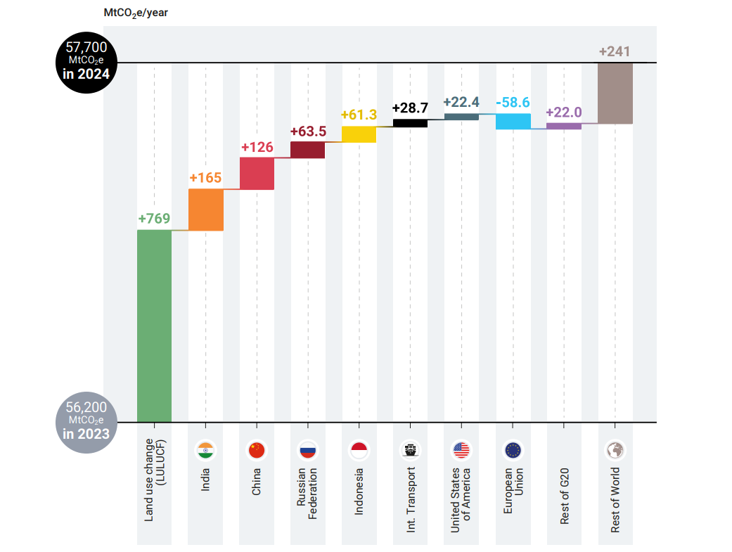ومن بين أكبر ست دول مصدرة لغازات الدفيئة، كان الاتحاد الأوروبي الدولة الوحيدة التي خفضت انبعاثاتها في عام 2024، وسجلت أعلى زيادة مطلقة في إجمالي انبعاثات غازات الدفيئة، باستثناء قطاع استخدام الأراضي وتغيير استخدام الأراضي والحراجة، في الهند والصين، بينما سجلت إندونيسيا أسرع نمو نسبي في الانبعاثات.