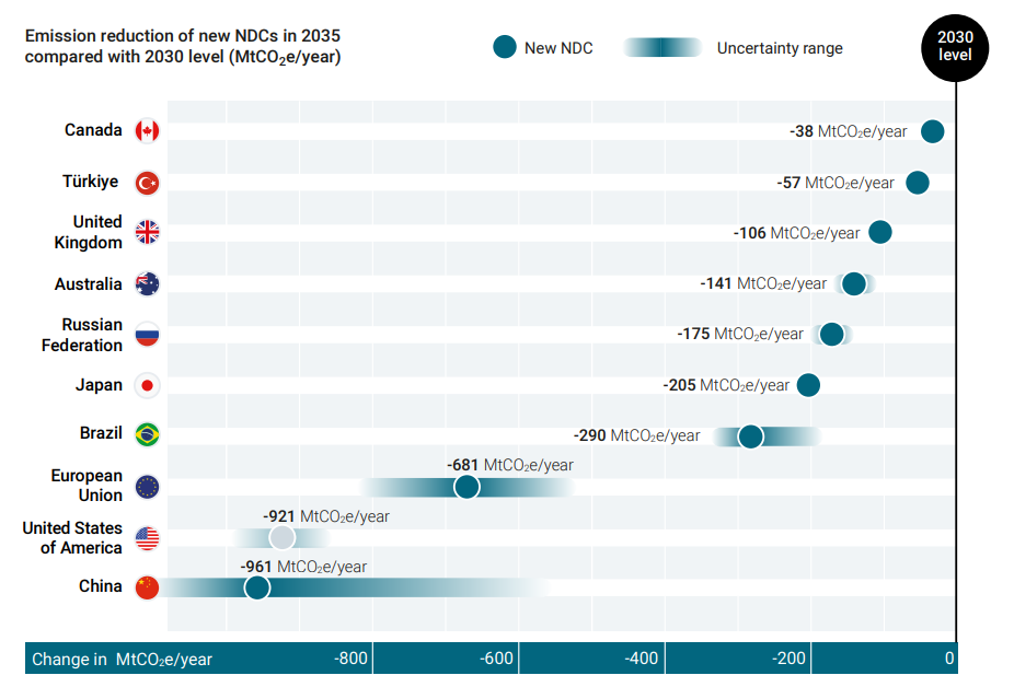 على الرغم من تقديم مساهمات محددة وطنيًا جديدة، لا تزال فجوة الانبعاثات في عامي 2030 و2035 كبيرة بين الانبعاثات المتوقعة في حال التنفيذ الكامل لهذه التعهدات، وبين المستويات المطلوبة للالتزام بمساري الحد من الاحترار العالمي عند درجتين مئويتين و1.5 درجة مئوية.