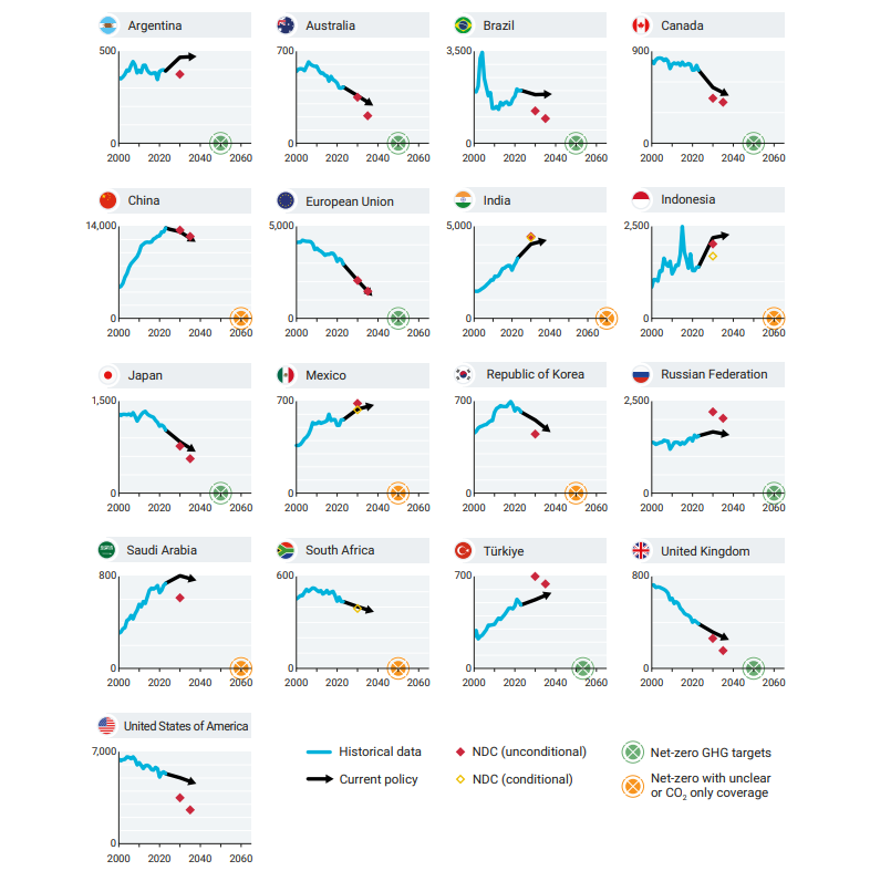 لا تسير سوى قلة من أعضاء مجموعة العشرين على مسار واضح نحو التزاماتهم بتحقيق صافي انبعاثات صفرية استناداً إلى السياسات الحالية وأهداف المساهمات المحددة وطنياً، وبالنسبة لأعضاء مجموعة العشرين الذين لم تبلغ انبعاثاتهم ذروتها بعد، فإن المساهمات المحددة وطنياً وأهداف صافي الانبعاثات الصفرية التي حددتها الدول لنفسها تشير إلى إطار زمني قصير جداً لبلوغ ذروة الانبعاثات والوصول إلى صافي انبعاثات صفرية.